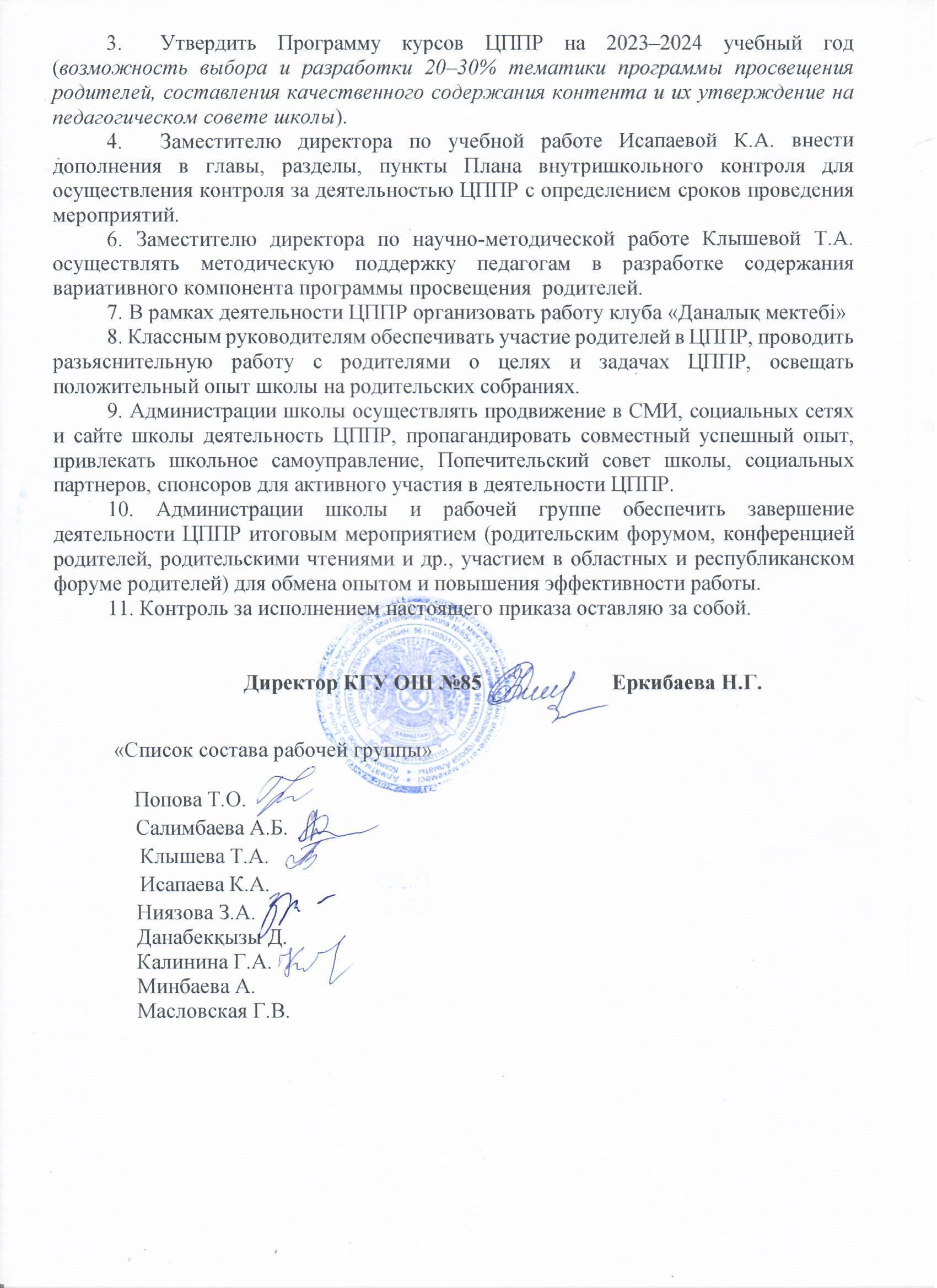 Ата-аналарды педагогикалық қолдау орталығын құру туралы бұйрық » №85 Орта мектеп