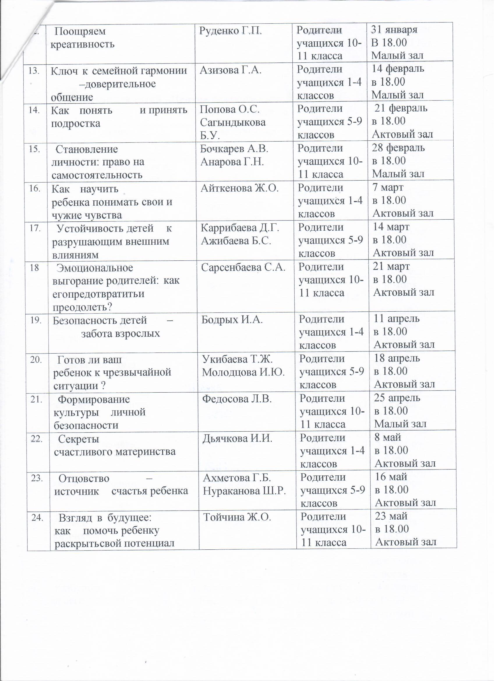 Ата-аналарды педагогикалық қолдау орталығының сабақ кестесі » №85 Орта мектеп