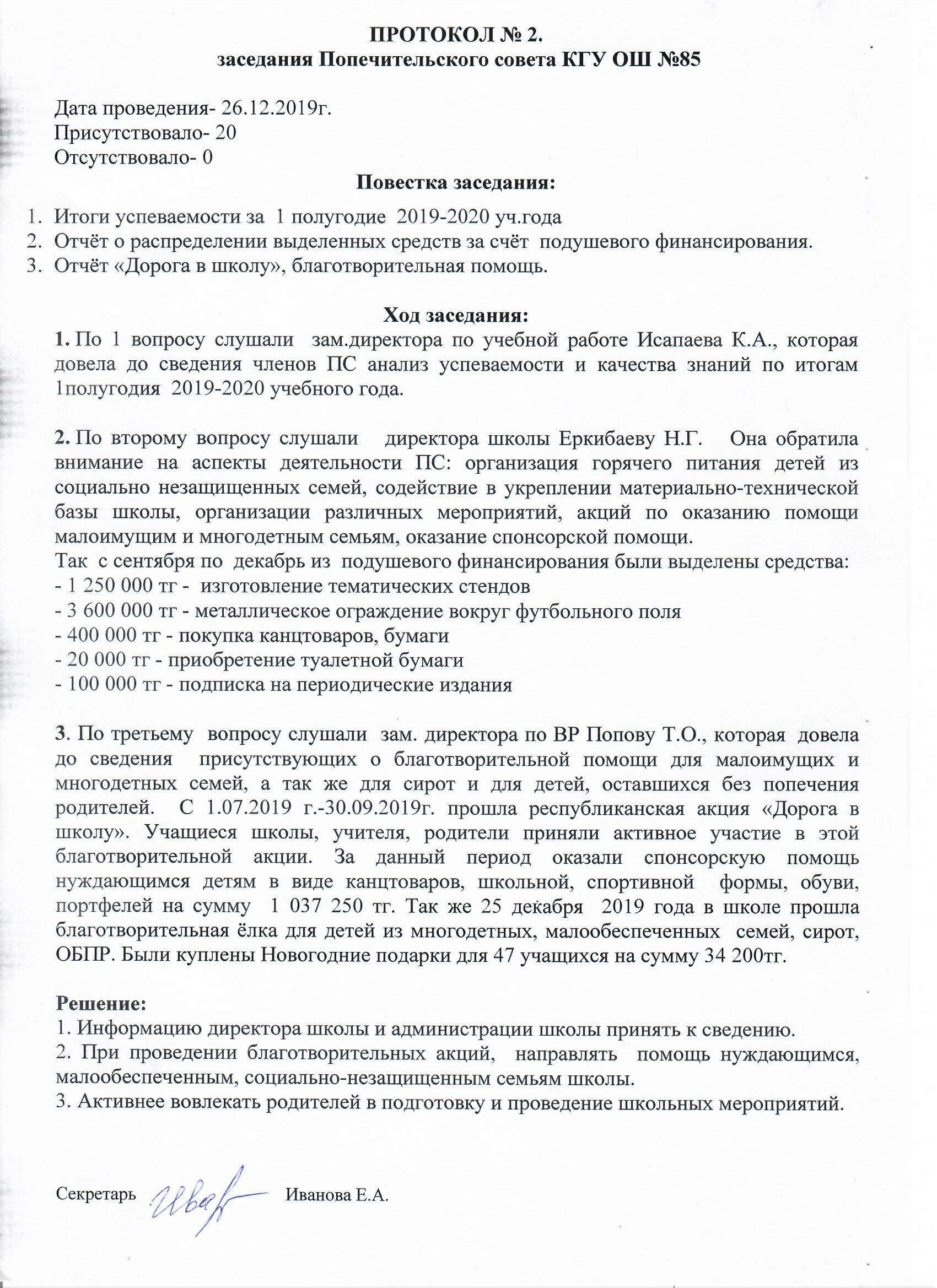 Протокол №2 заседания Попечительского совета » №85 Орта мектеп