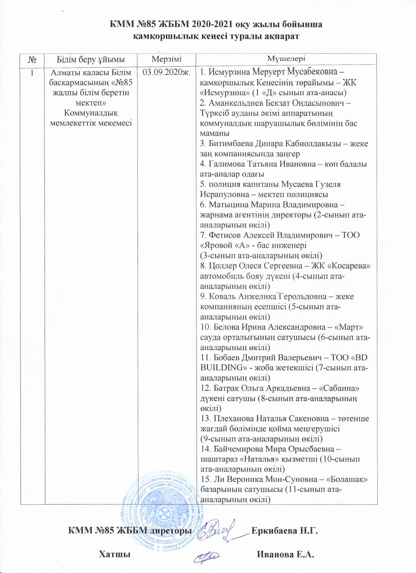 Информация о попечительском совете на 2020-2021 учебный год » №85 Орта мектеп