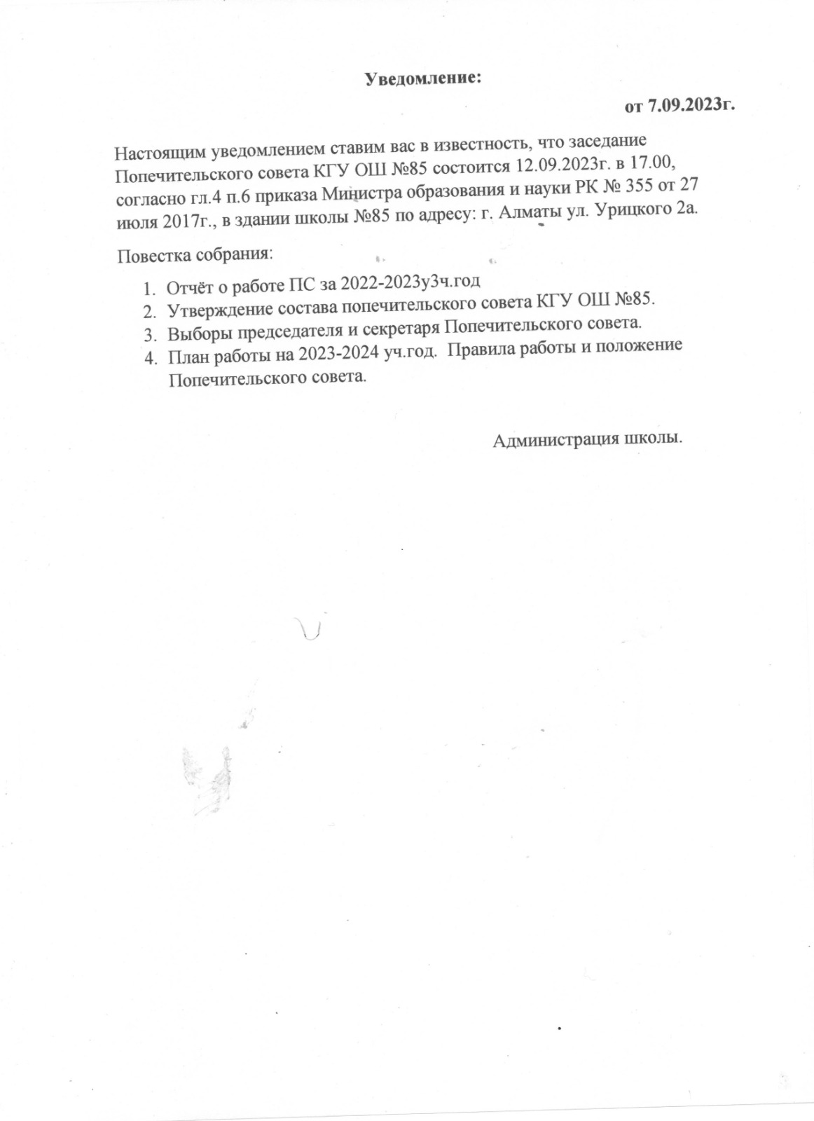 12.09.2023 ж. Қамқоршылық кеңестің отырысын шақыру туралы хабарлама » №85 Орта мектеп