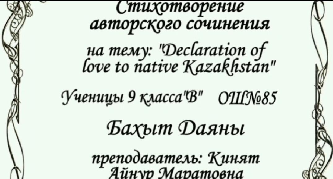 14 декабрь 2020 0 1 2 3 4 5 Творческий конкурс "Declaration of love to Kazakhstan" Учащиеся 9-х классов КГУ ОШ №85 приняли участие в конкурсе стихотворений собственного сочинения о Казахстане на английском языке.