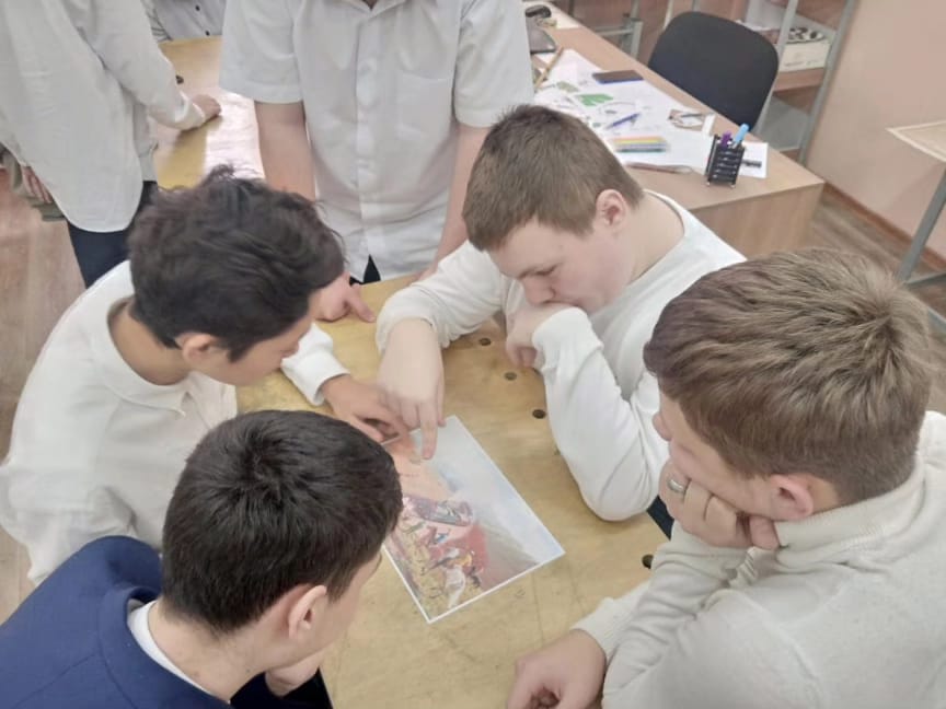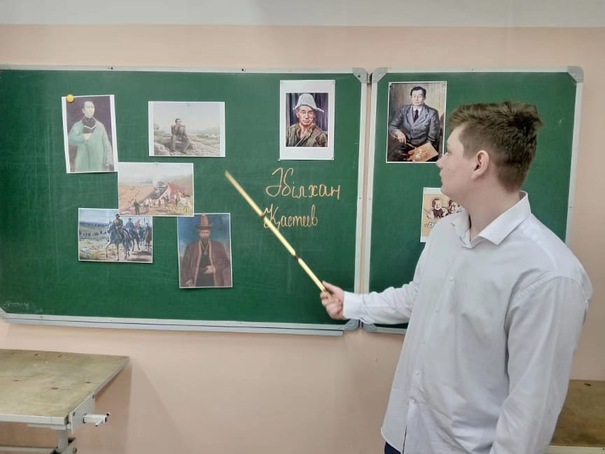Көркем еңбек мұғалімі А.В. Бочкарев 14 Қаңтарда Ә. Қастеевтің 120 жылдығын мерекелеу аясында 9-сынып оқушыларына арналған "Жұмбақтар. Тағдыр. Атаулар. Әбілхан Қастеев" деректі фильмді көріп, әңгімелесу өткізді.