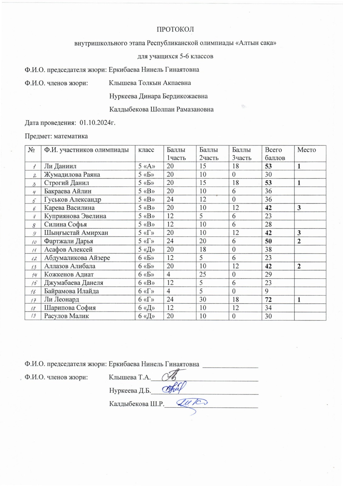 1 октября 2024 года в школе прошёл внутришкольный тур республиканской олимпиады по математике "Алтын сақа". Приняли участие ученики 5-6 классов.
