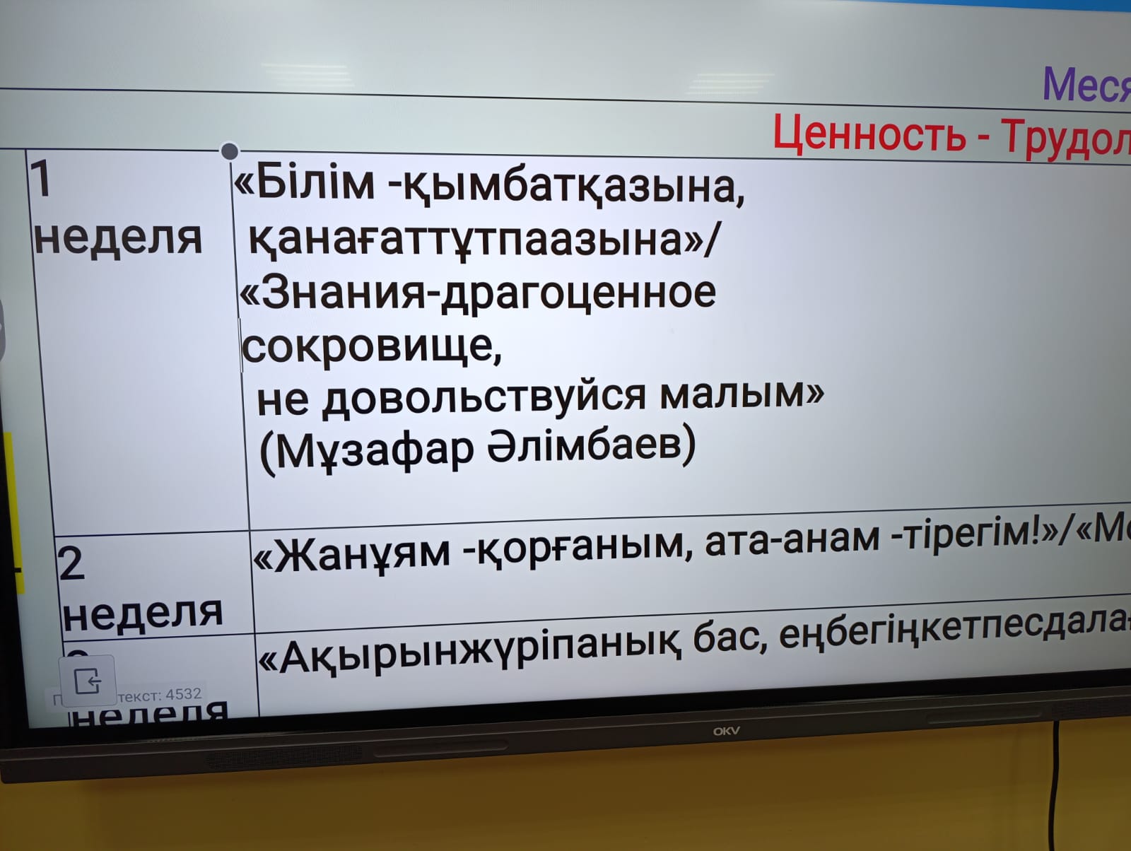 05 сентябрь 2024 0 1 2 3 4 5 Аптаның дәйексөзі Апта сайын мектепте экрандарда аптаның дәйексөзі пайда болады. Каждую неделю в школе на экранах появляется цитата недели.