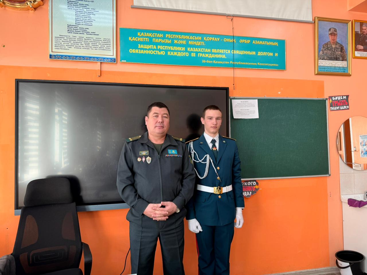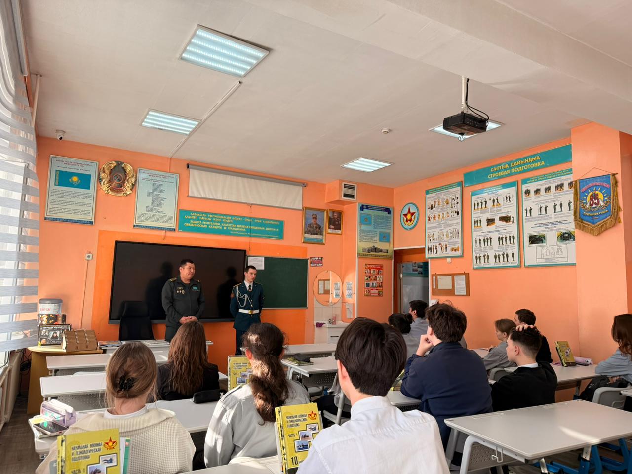 Курсант 2 курса Жас Ұлан им. Б. Момышұлы Киндиров Кирилл провёл беседу с учащимися 9-х классов о поступлении в военный колледж.