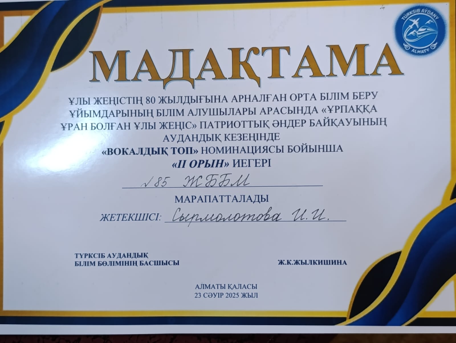 23 апрель 2025 0 1 2 3 4 5 Жеңіс күніне арналған іс шаралар Аудандық әскери-патриоттық ән байқауына қатысу. Участие в районном конкурсе военно-патриотической песни.
