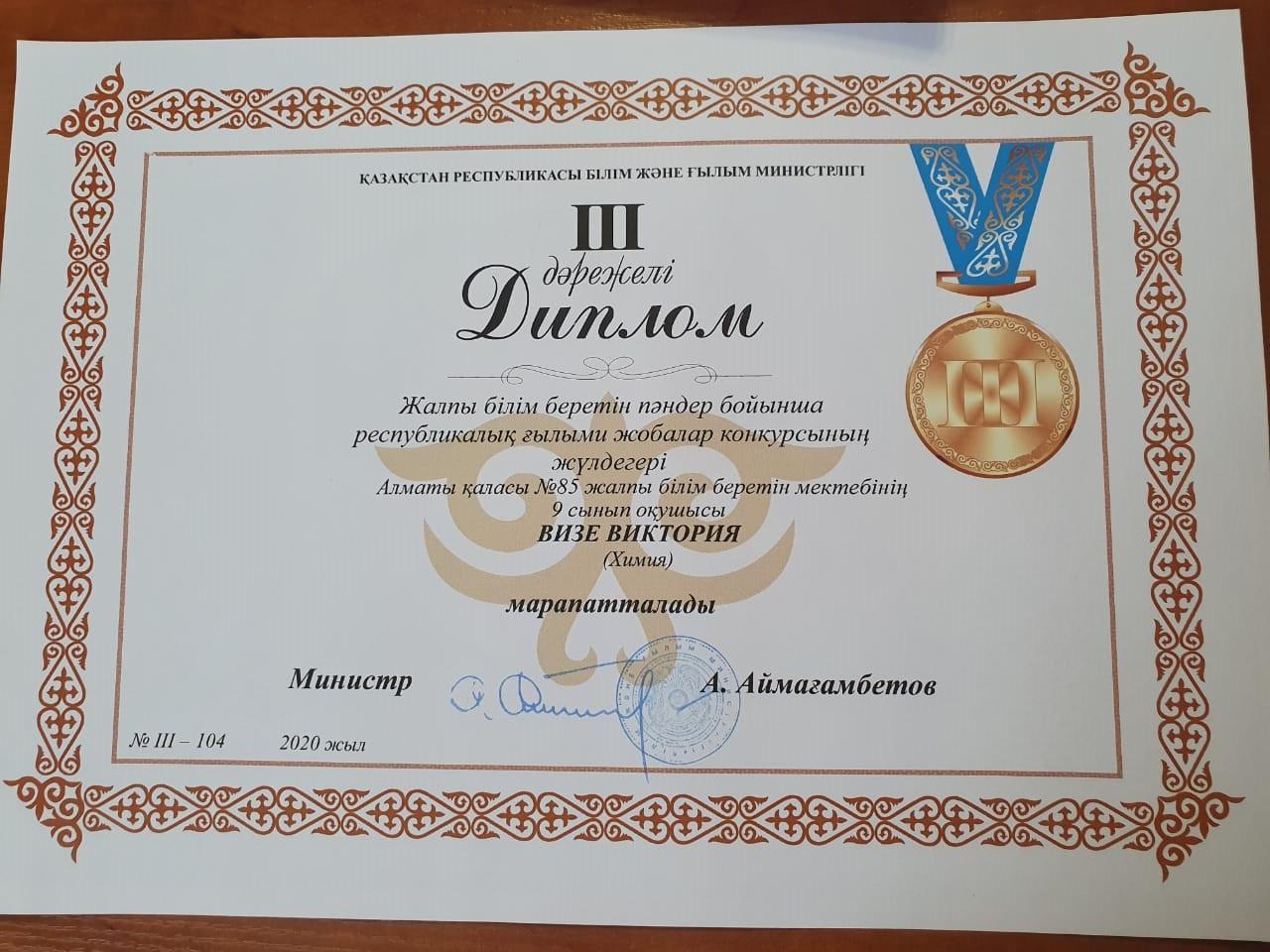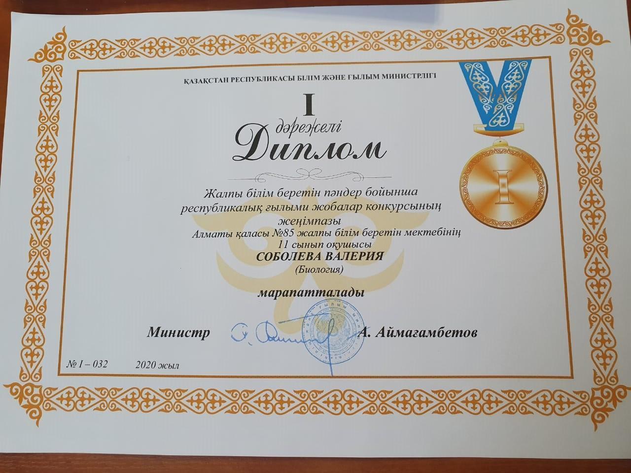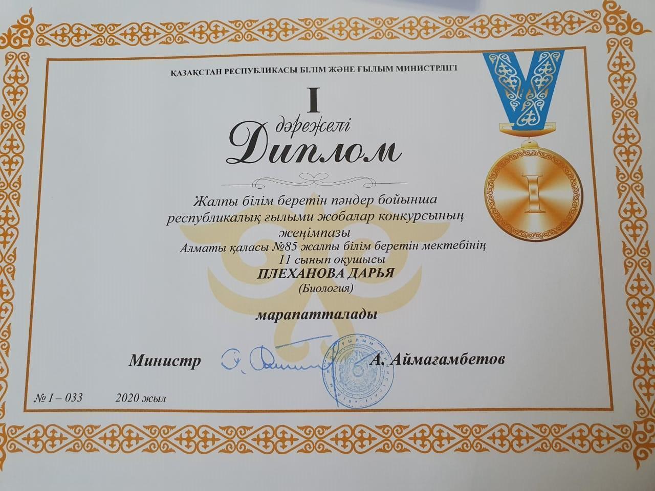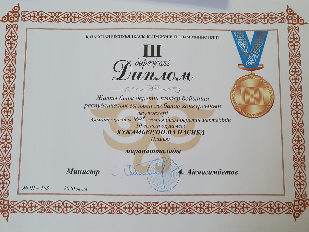 Ученицы КГУ ОШ №85, приняв участие в Республиканском конкурсе научных проектов по химии и биологии, были удостоены призовых мест.