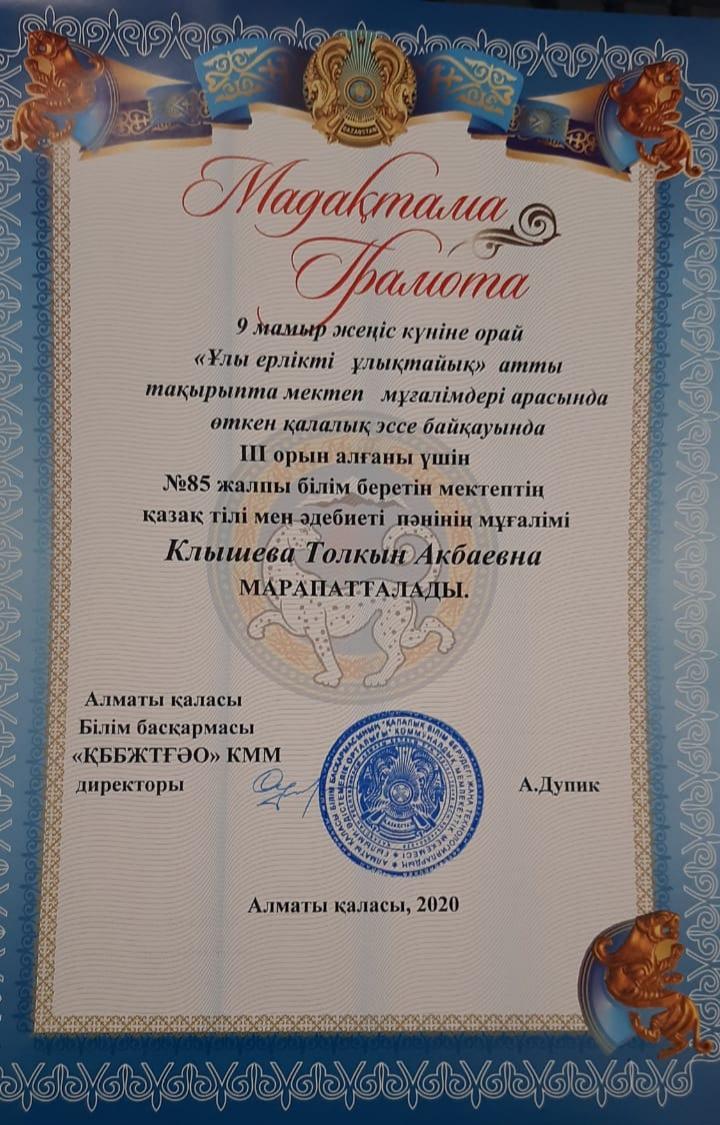 31 август 2020 0 1 2 3 4 5 Наши достижения Грамотой за 3 место в городском конкурсе эссе "Ұлы ерлікті ұлықтайық", посвященном Дню Победы, награждается учитель казахского языка и литературы Клышева Толкын Акбаевна! Поздравляем!