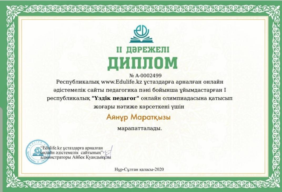 24 октябрь 2020 0 1 2 3 4 5 Наши достижения Дипломом II степени и благодарственным письмом за участие в дистанционной олимпиаде для учителей "Үздік педагог" награждается учитель английского языка КГК ОШ №85 Кинят А.М. Поздравляем!