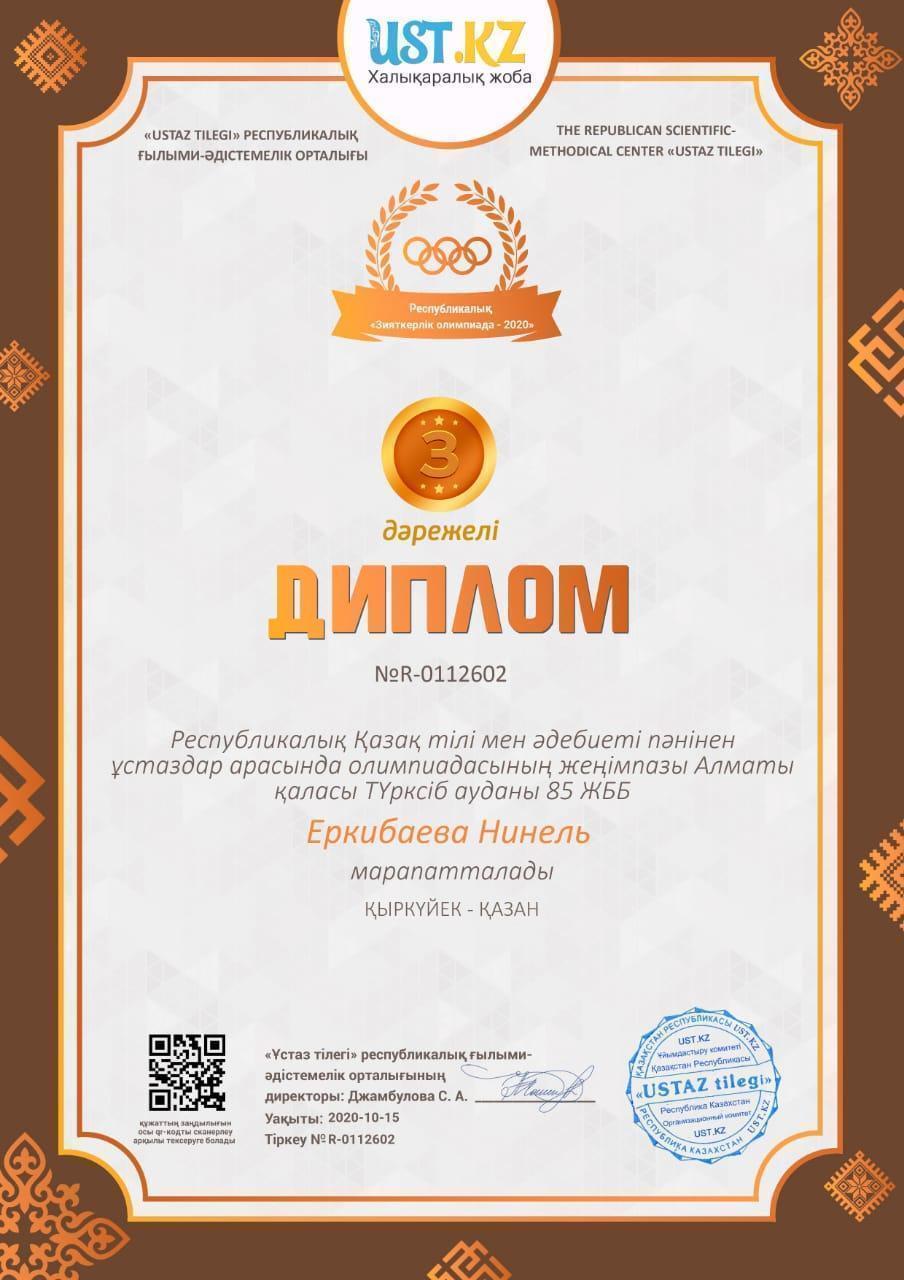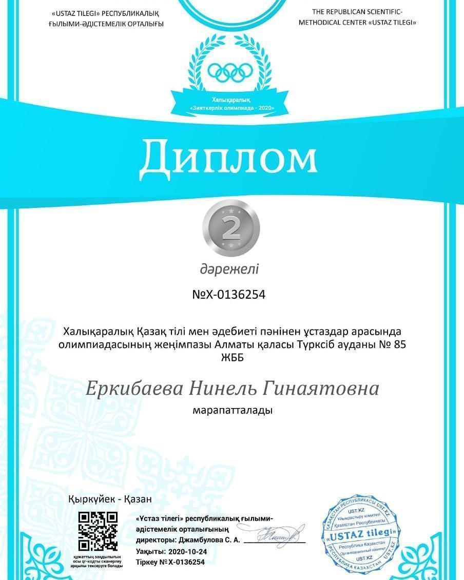 26 октябрь 2020 0 1 2 3 4 5 Наши достижения Дипломами II и III степени за участие в дистанционной олимпиаде для учителей награждается директор КГУ ОШ №85 Еркибаева Н.Г. Поздравляем!
