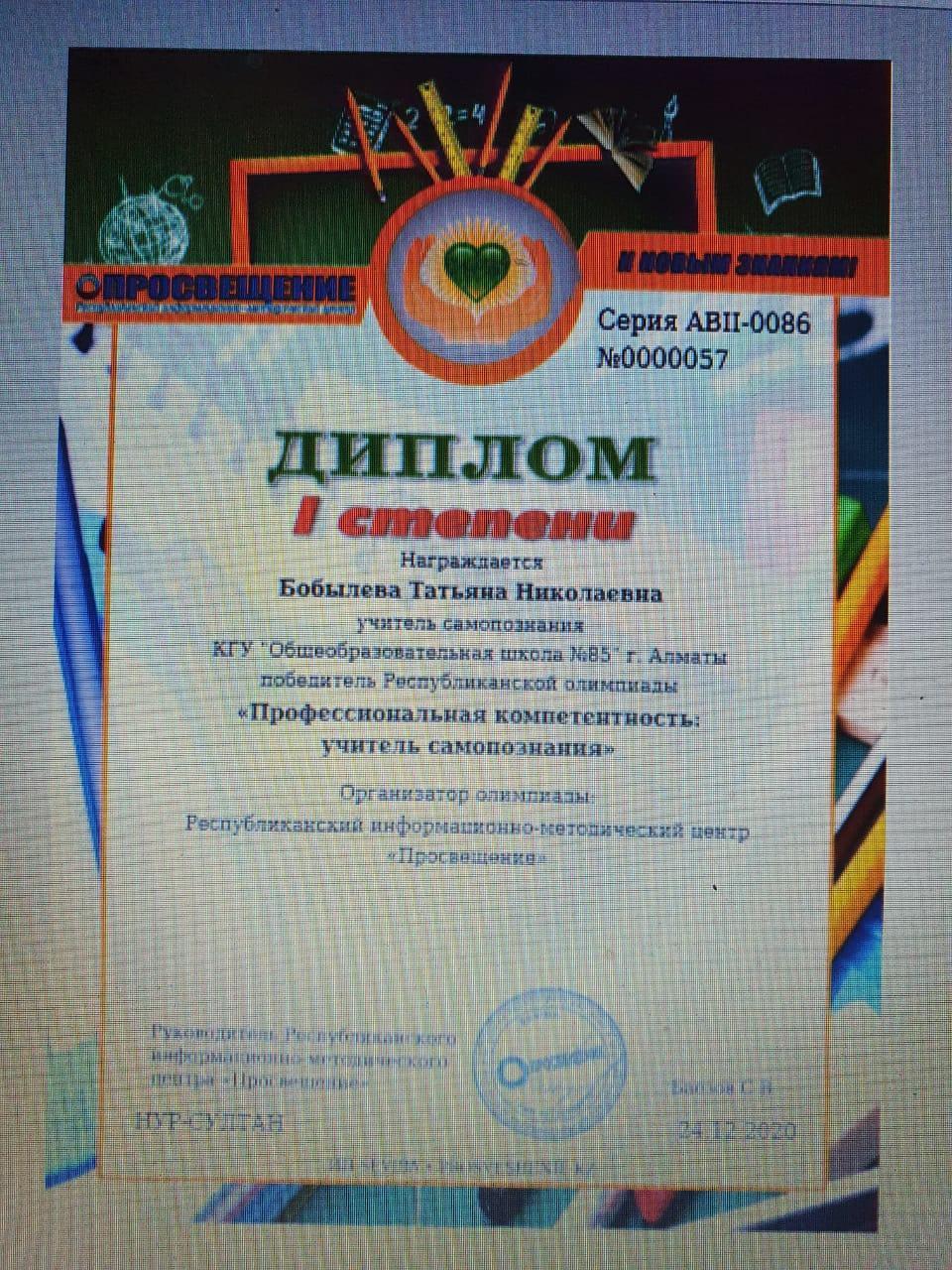 08 январь 2021 0 1 2 3 4 5 Наши достижения Учитель самопознания КГУ ОШ №85 Бобылева Т.Н. награждается дипломом 1 степени за участие в Республиканской олимпиаде "Профессиональная компетентность: учитель самопознания".