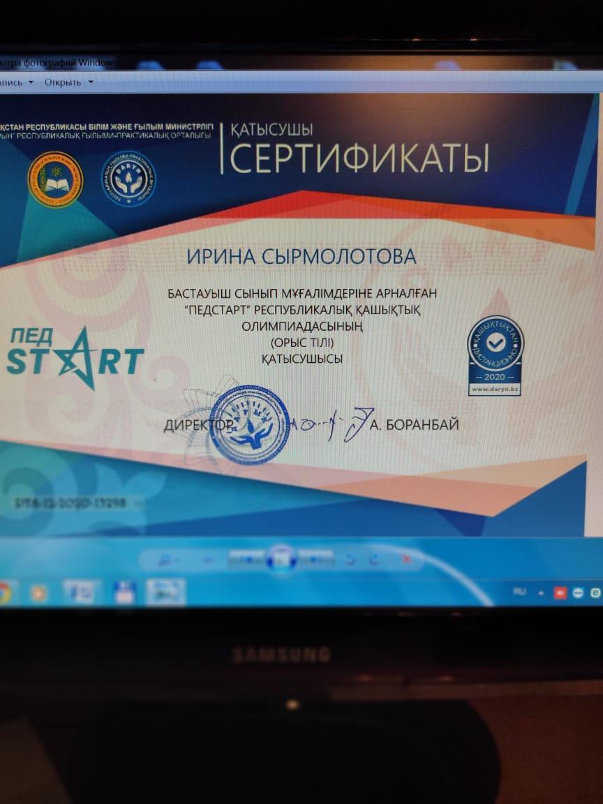 16 январь 2021 0 1 2 3 4 5 Наши достижения Сертификатом за учатие в Республиканской олимпиаде лоя учителей "Педстарт" награждается учитель начальных классов Сырмолотова И.И.