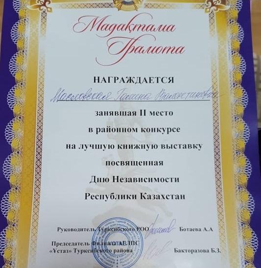 Поздравляем школьного библиотекаря Масловскую Галину Валентиновну с победой! 2 место в районном конкурсе книжной выставки, посвященном Дню Независимости Республики Казахстан!