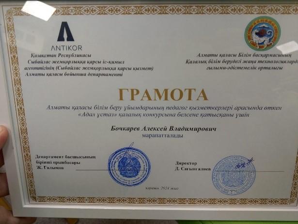31 октябрь 2024 0 1 2 3 4 5 Жетістіктеріміз А.В. Бочкарев "Адал ұстаз" байқауында ауданда 2 орын алды. Құттықтаймыз! Бочкарев А.В. занял 2 место по району в конкурсе «Адал ұстаз». Поздравляем!