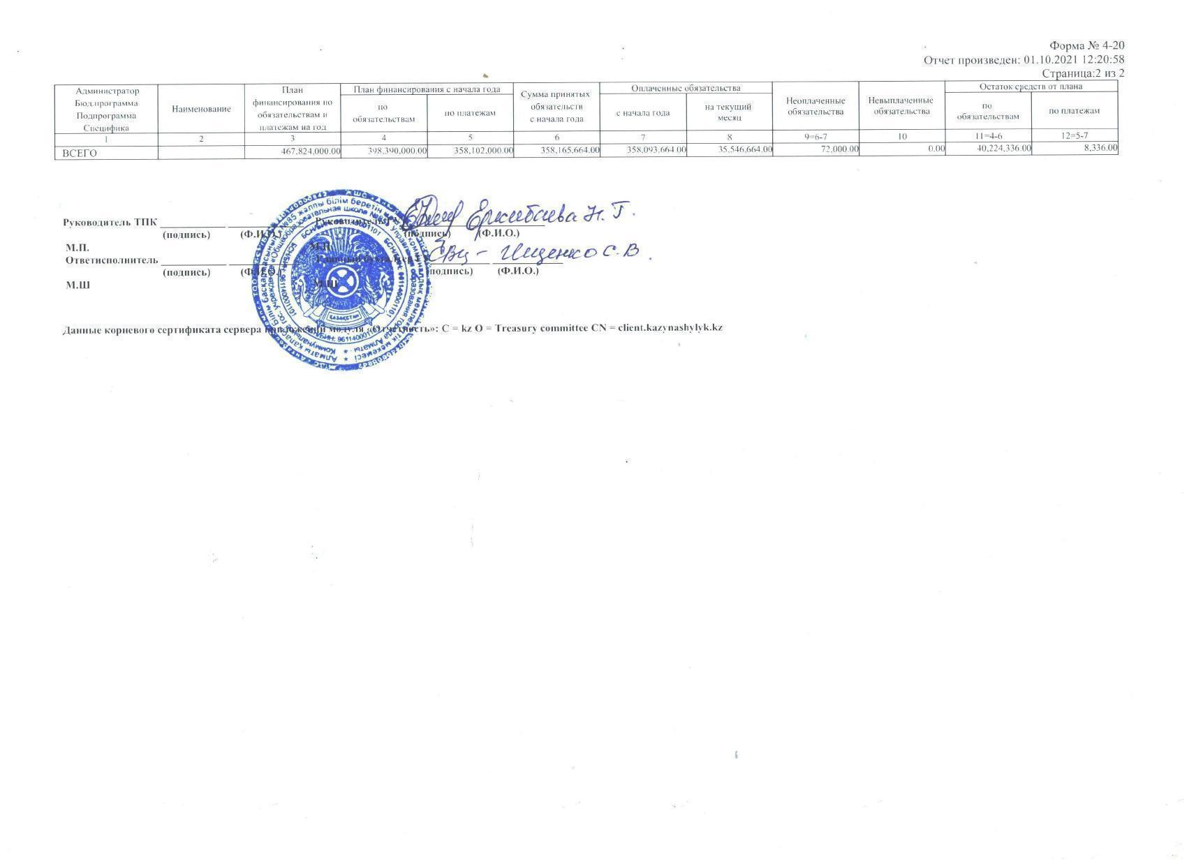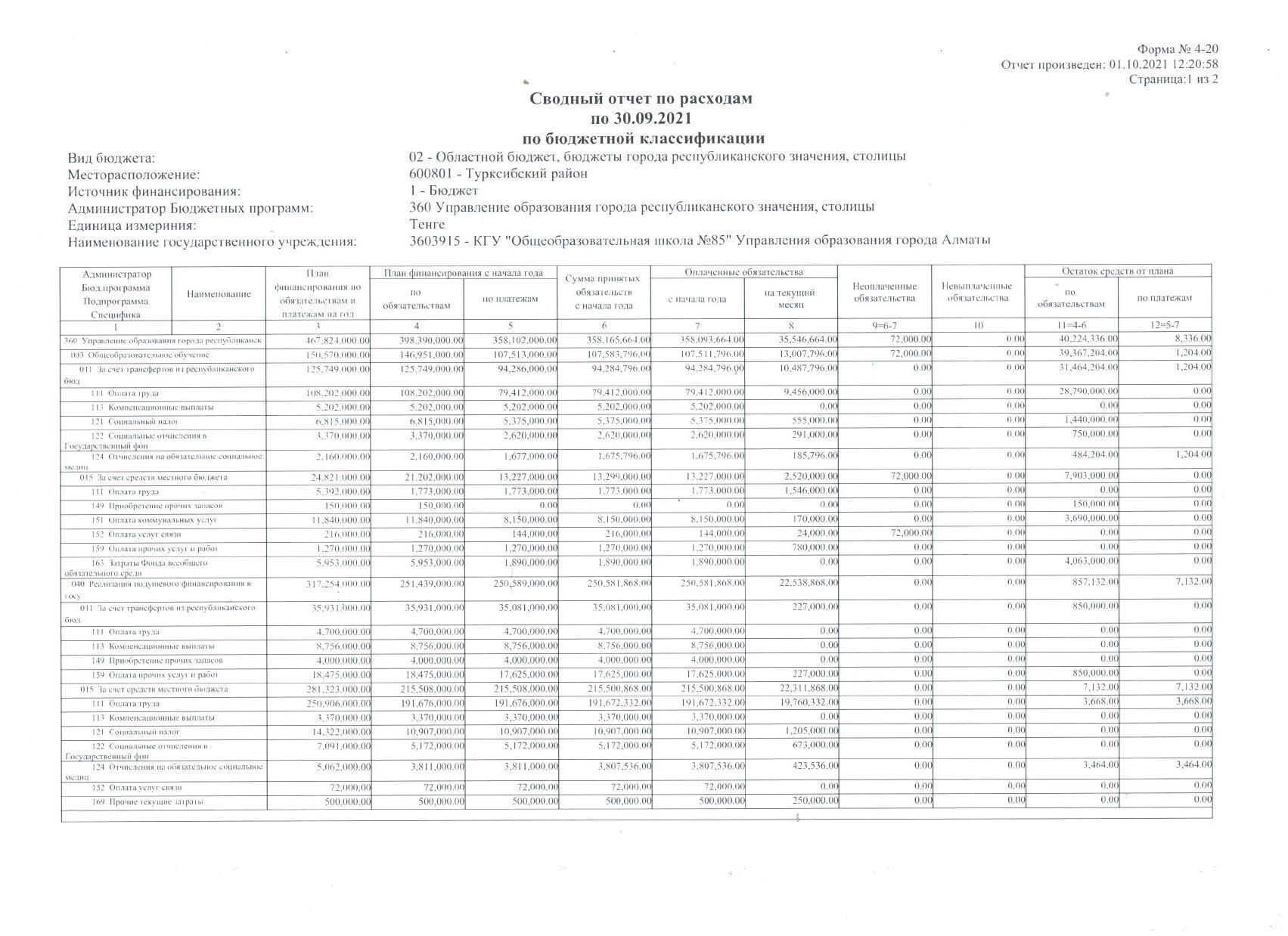 Сводный отчет по расходам на 30.09.2021 г. » №85 Орта мектеп