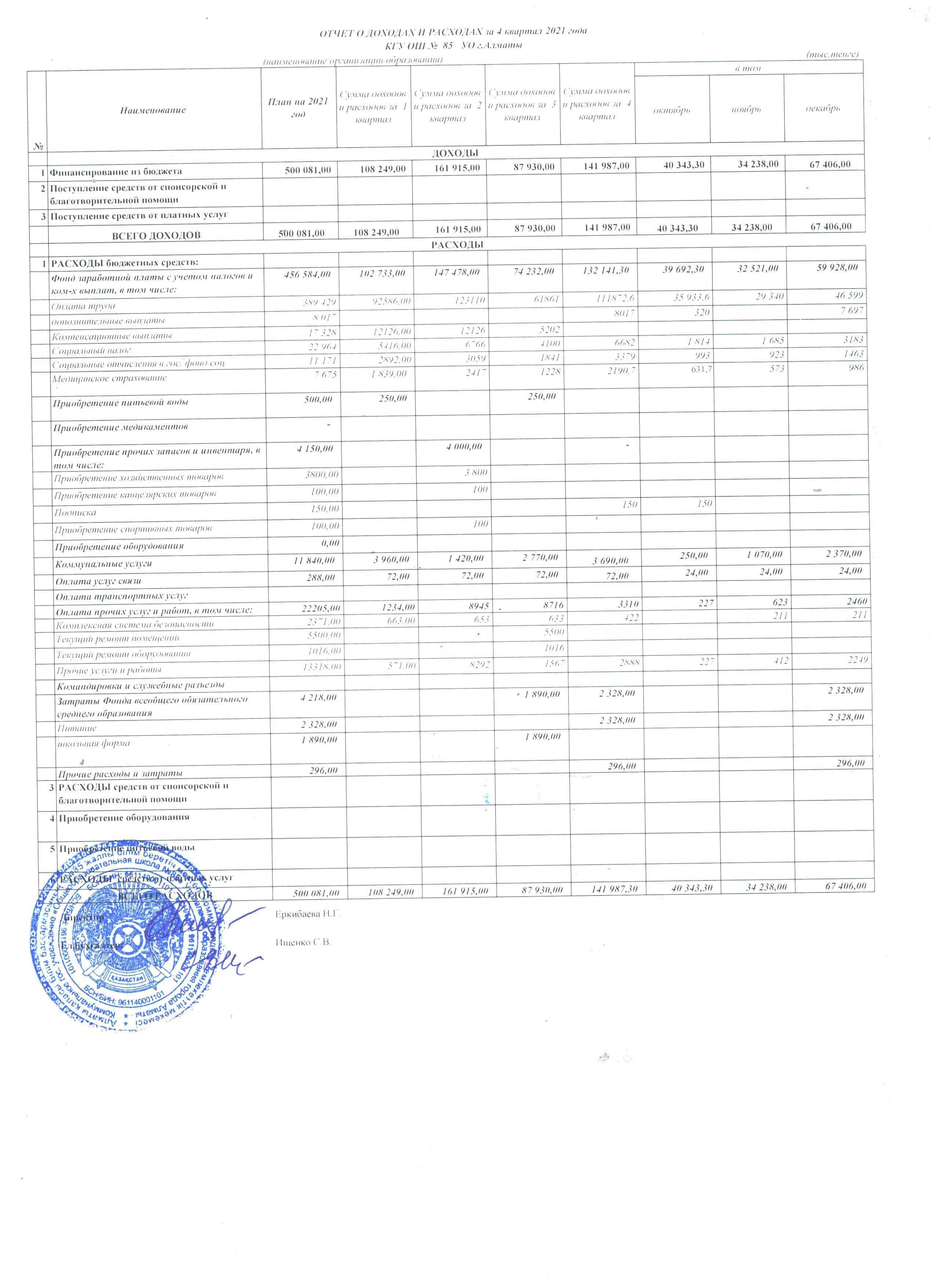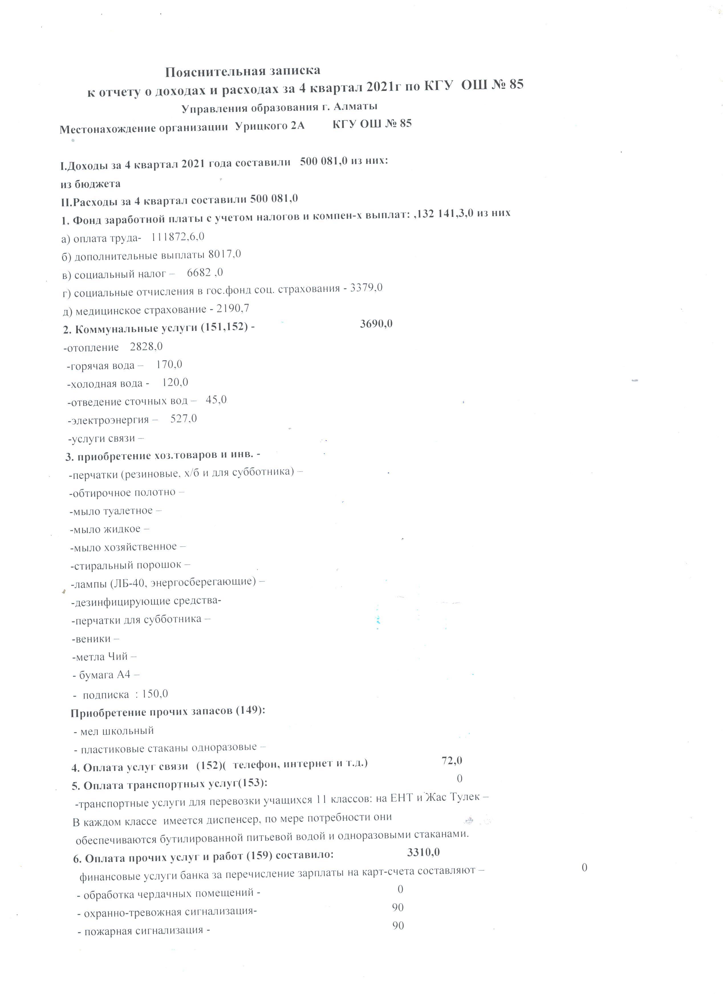 Отчет о доходах и расходах за 4 квартал 2021 года » №85 Орта мектеп