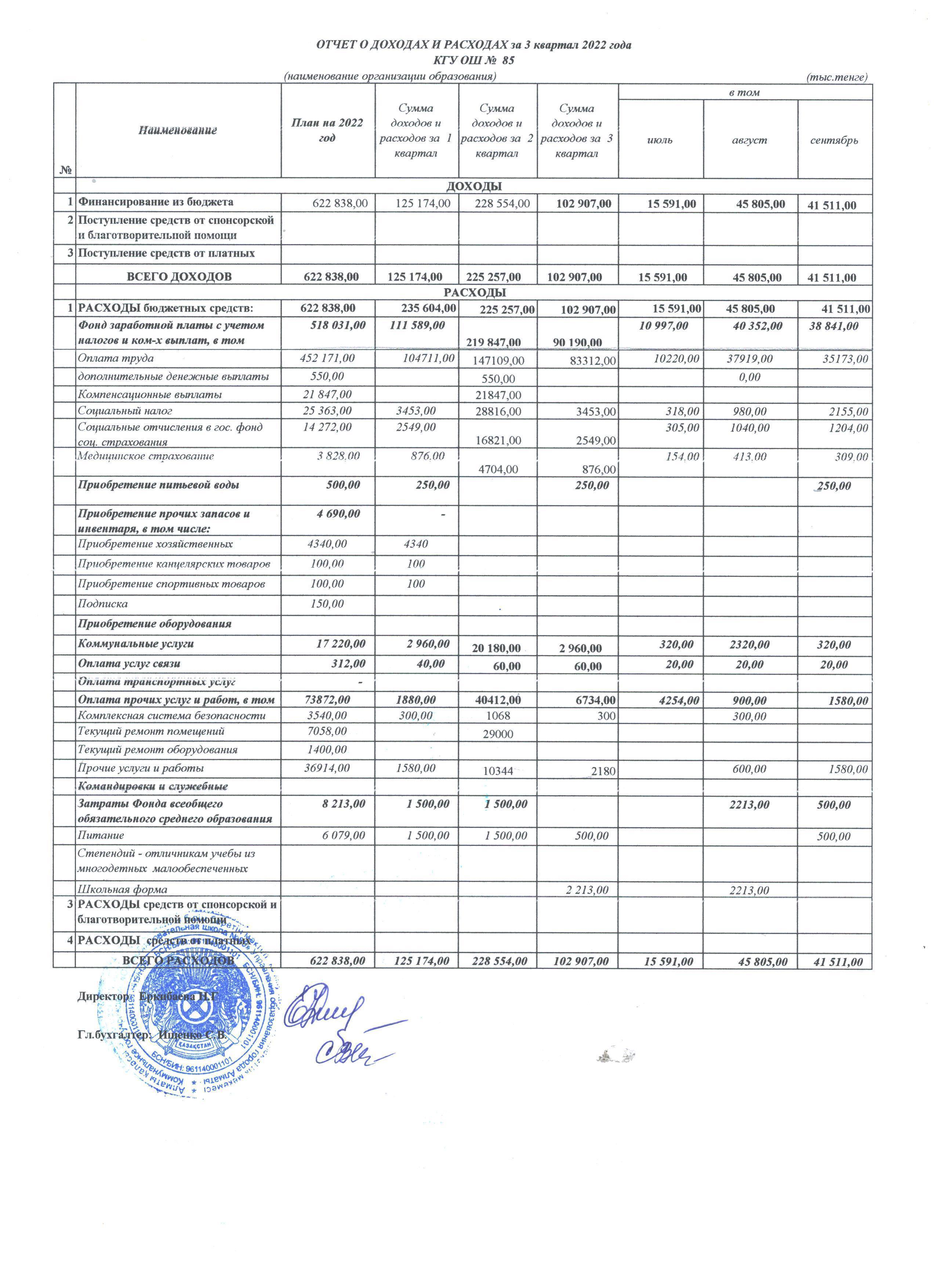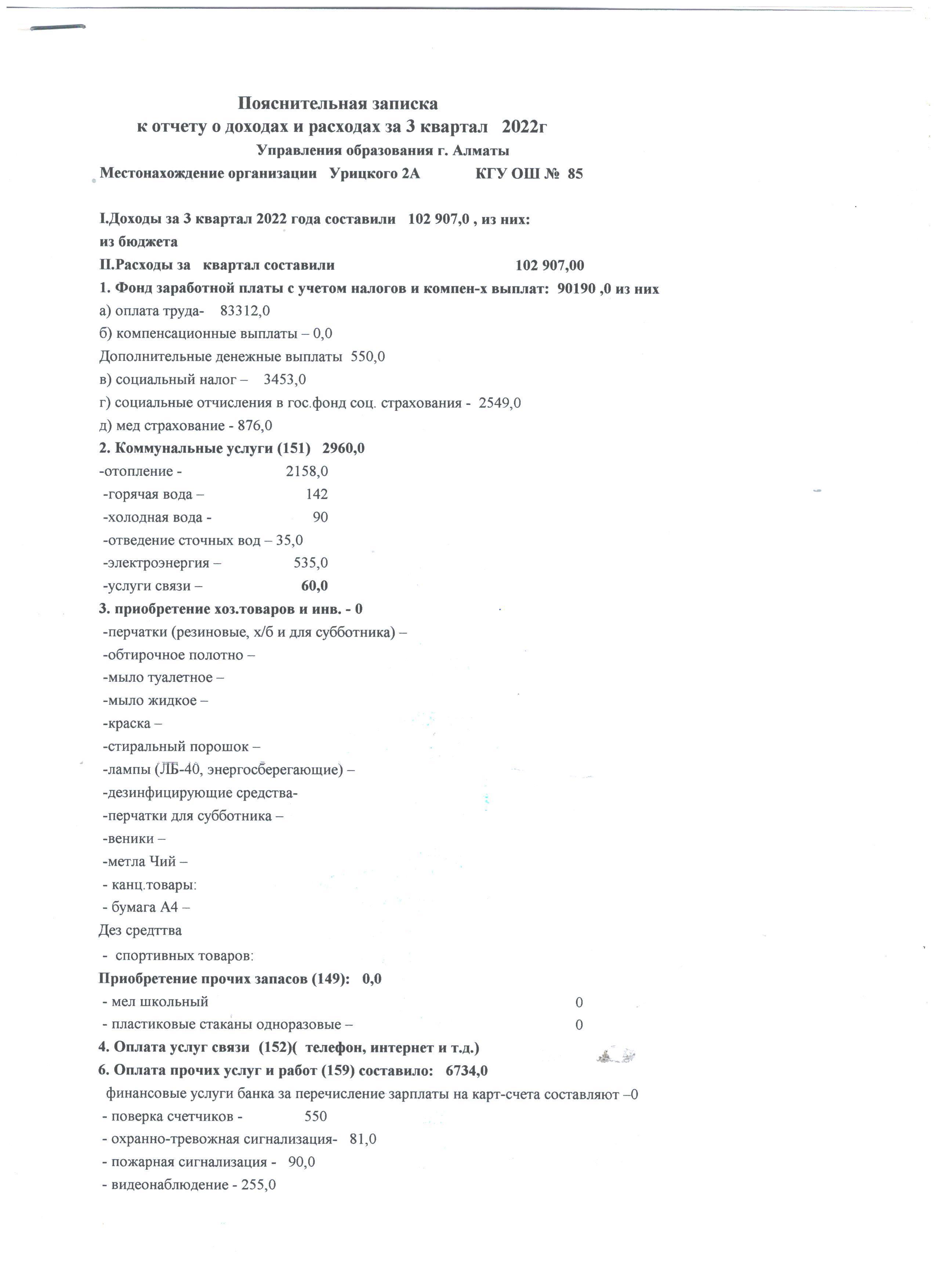 2022 жылғы 3 тоқсандағы кіріс және шығыс есебі » №85 Орта мектеп