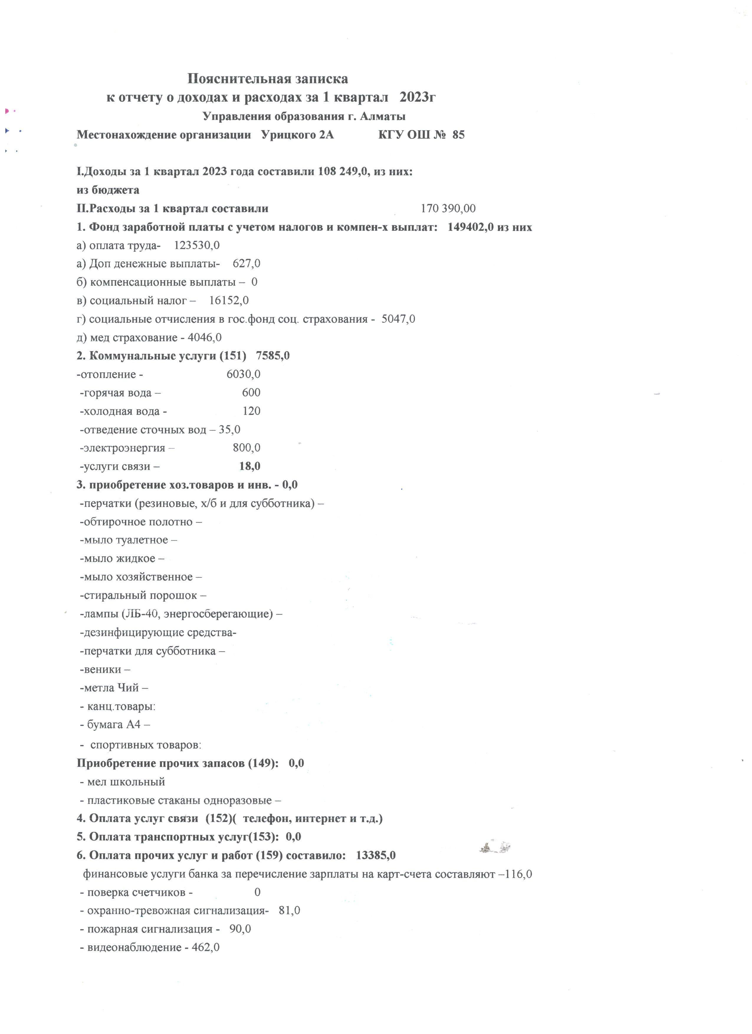 2023 жылғы 1 тоқсандағы кіріс және шығыс есебі » №85 Орта мектеп