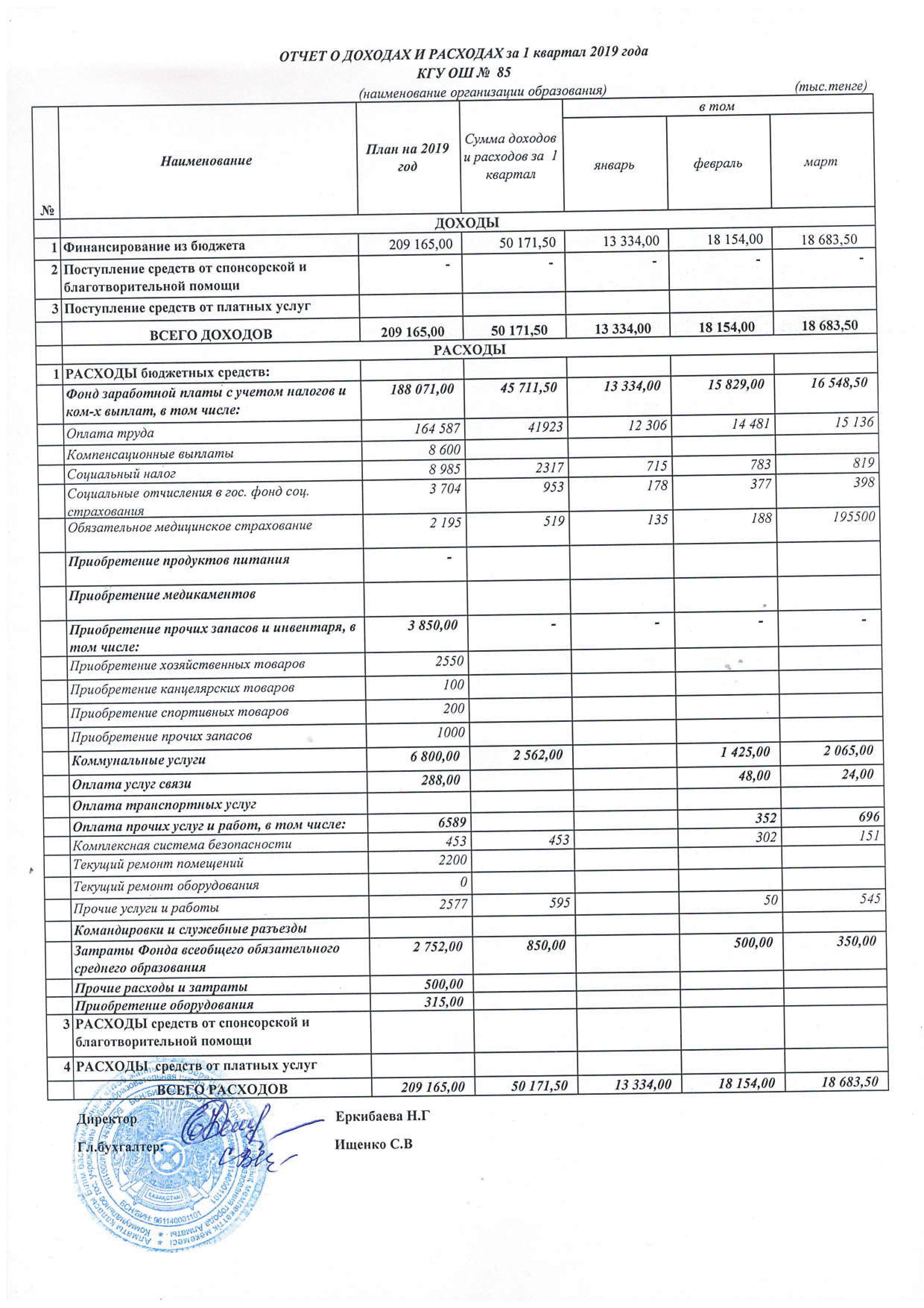 Отчет о доходах и расходах за 1 кв 2019 » №85 Орта мектеп