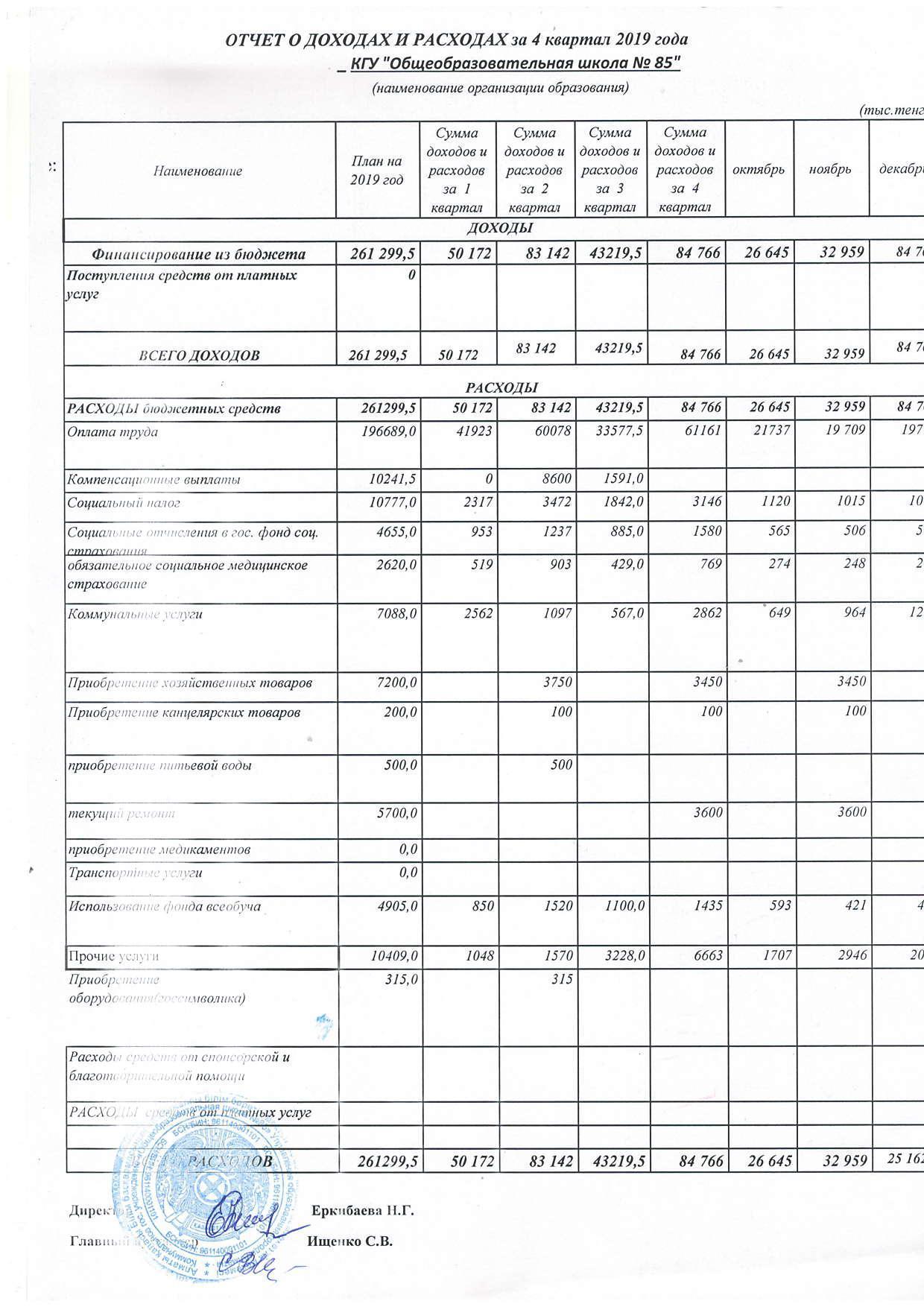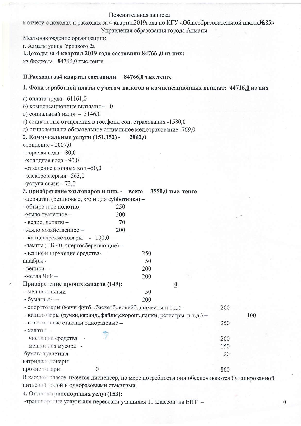 Отчет о доходах и расходах 4 кв 2019 » №85 Орта мектеп