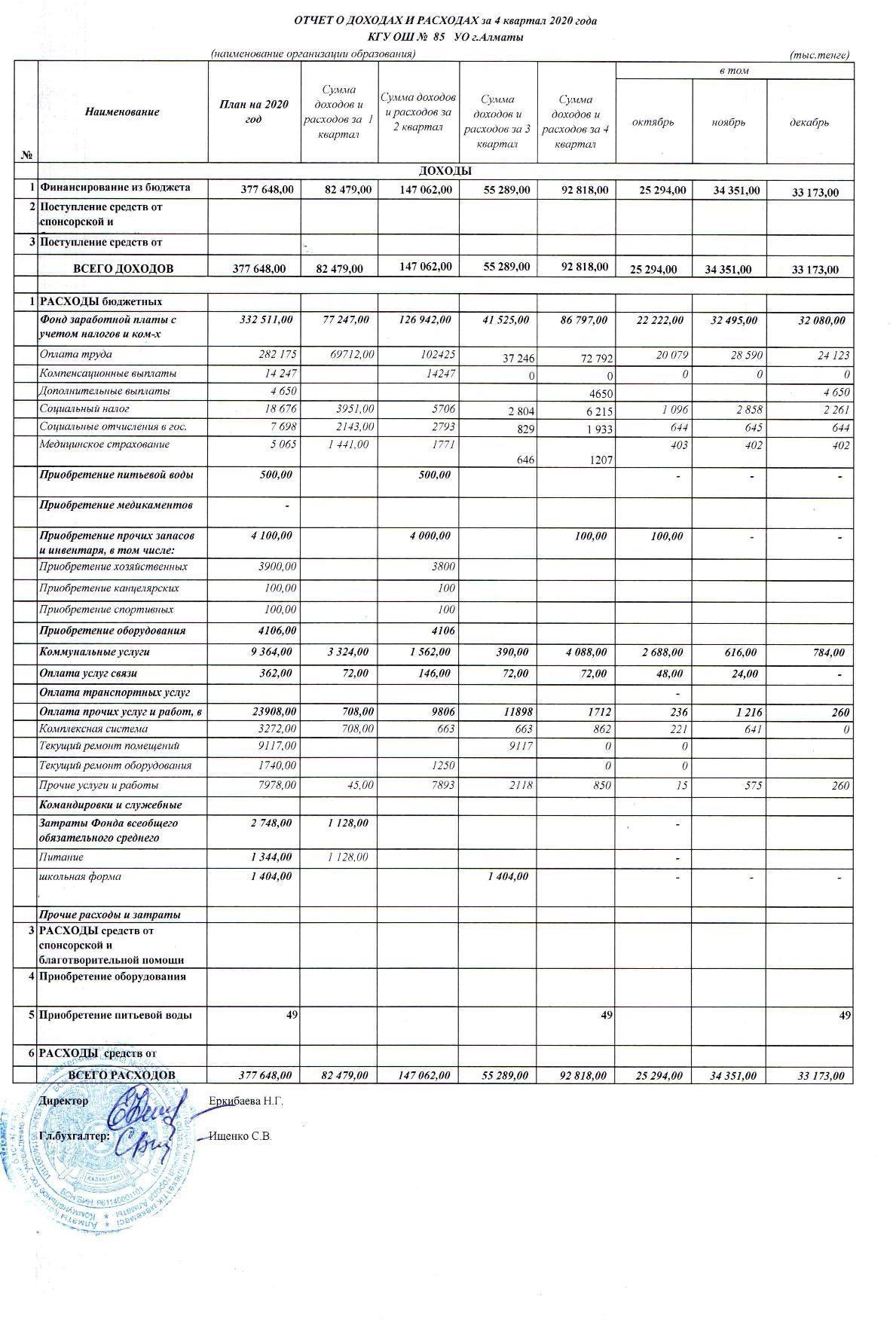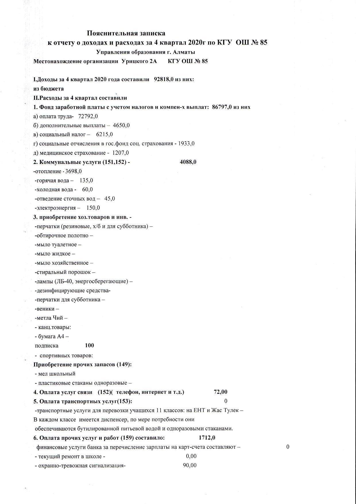 Отчет о доходах и расходах за 4 кв 2020 » №85 Орта мектеп