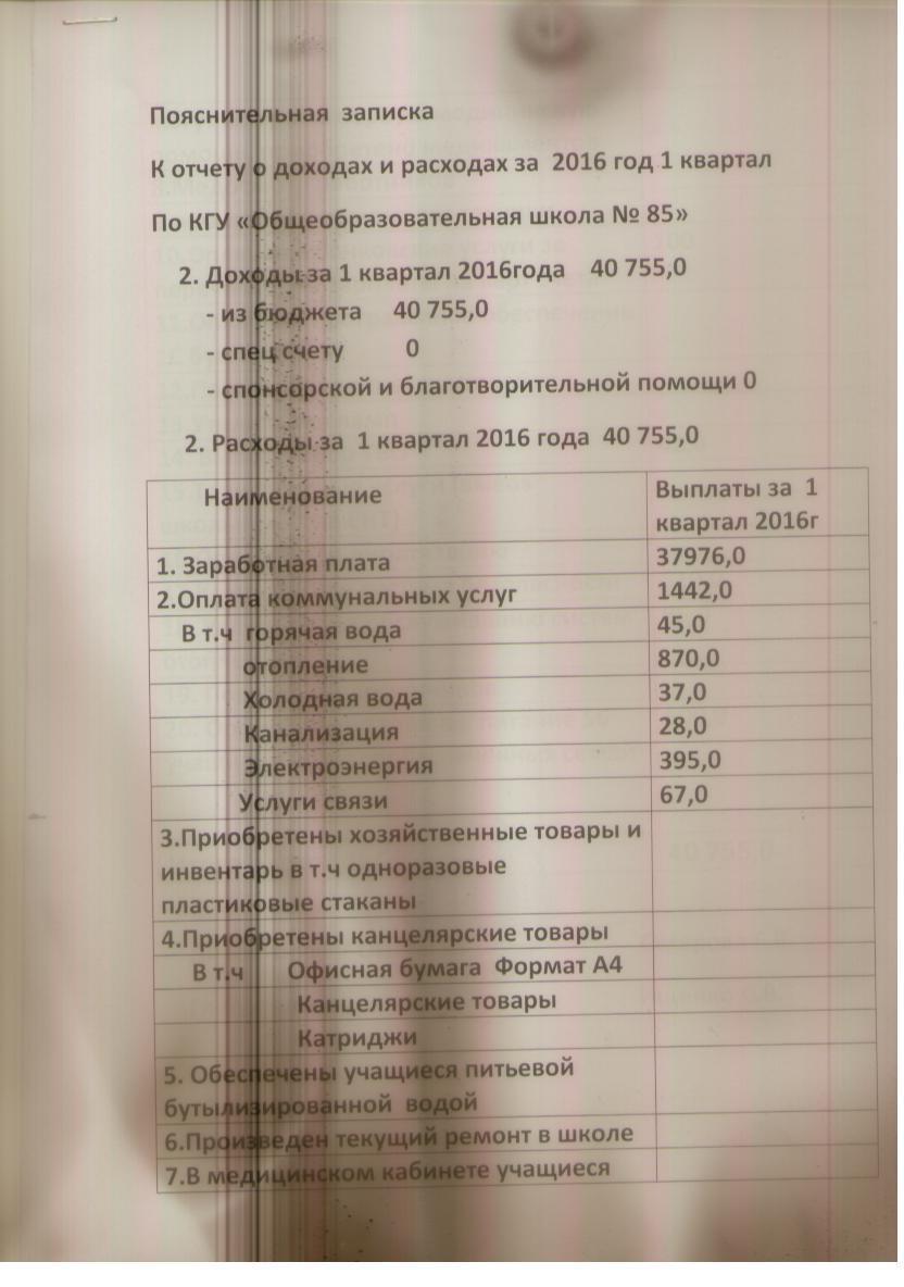 Отчет о доходах и расходах за 1 квартал 2016 и пояснительная записка » №85 Орта мектеп