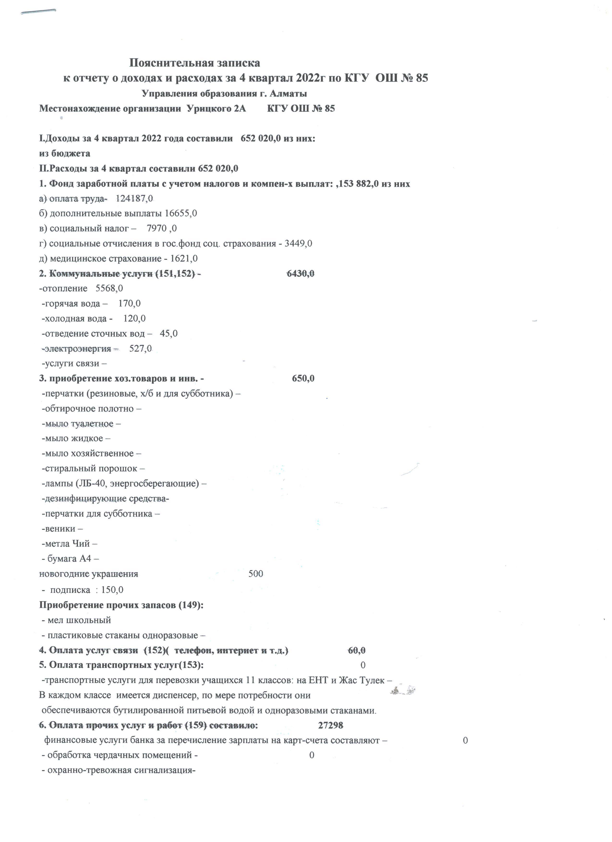2022 жылғы 4 тоқсандағы кіріс және шығыс есебі » №85 Орта мектеп