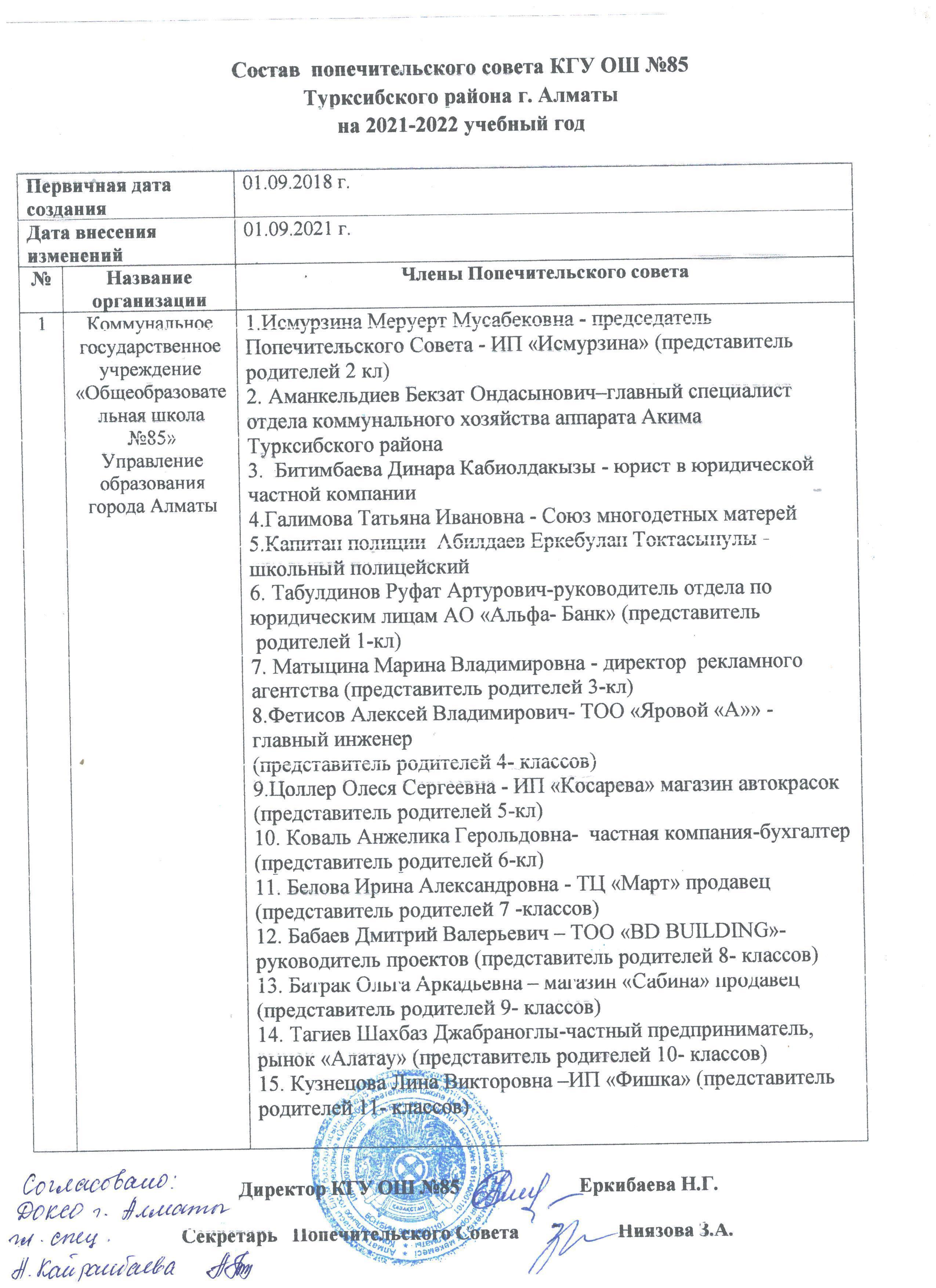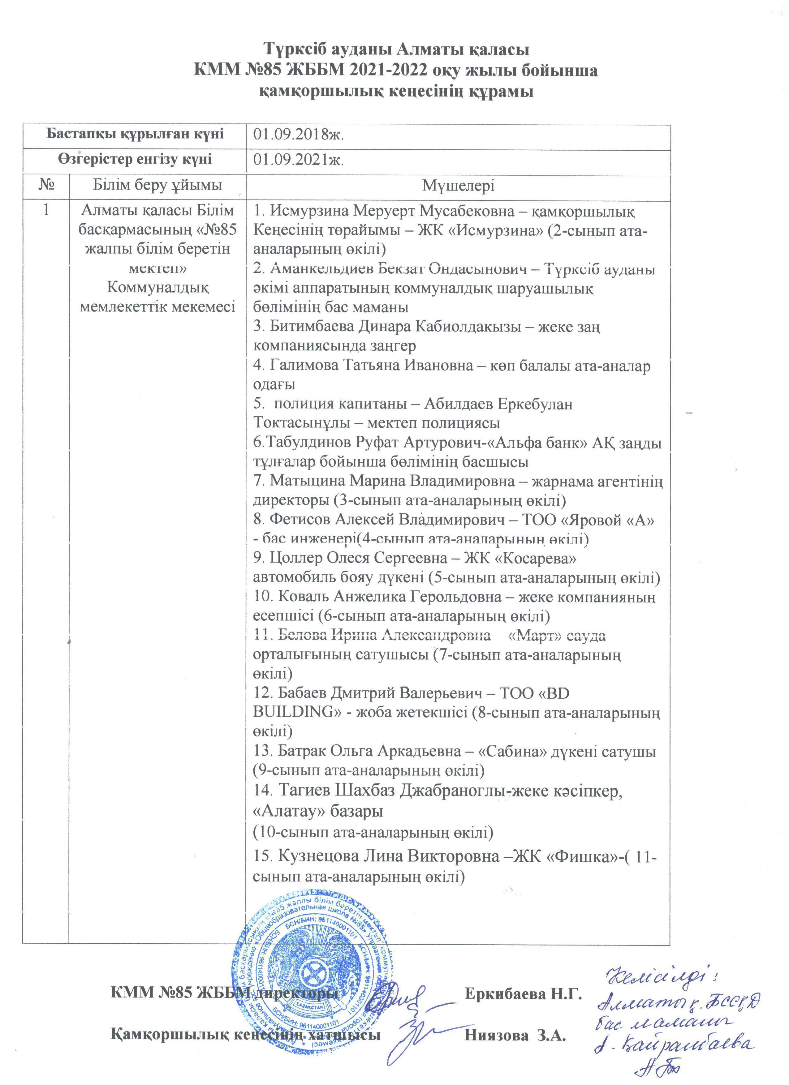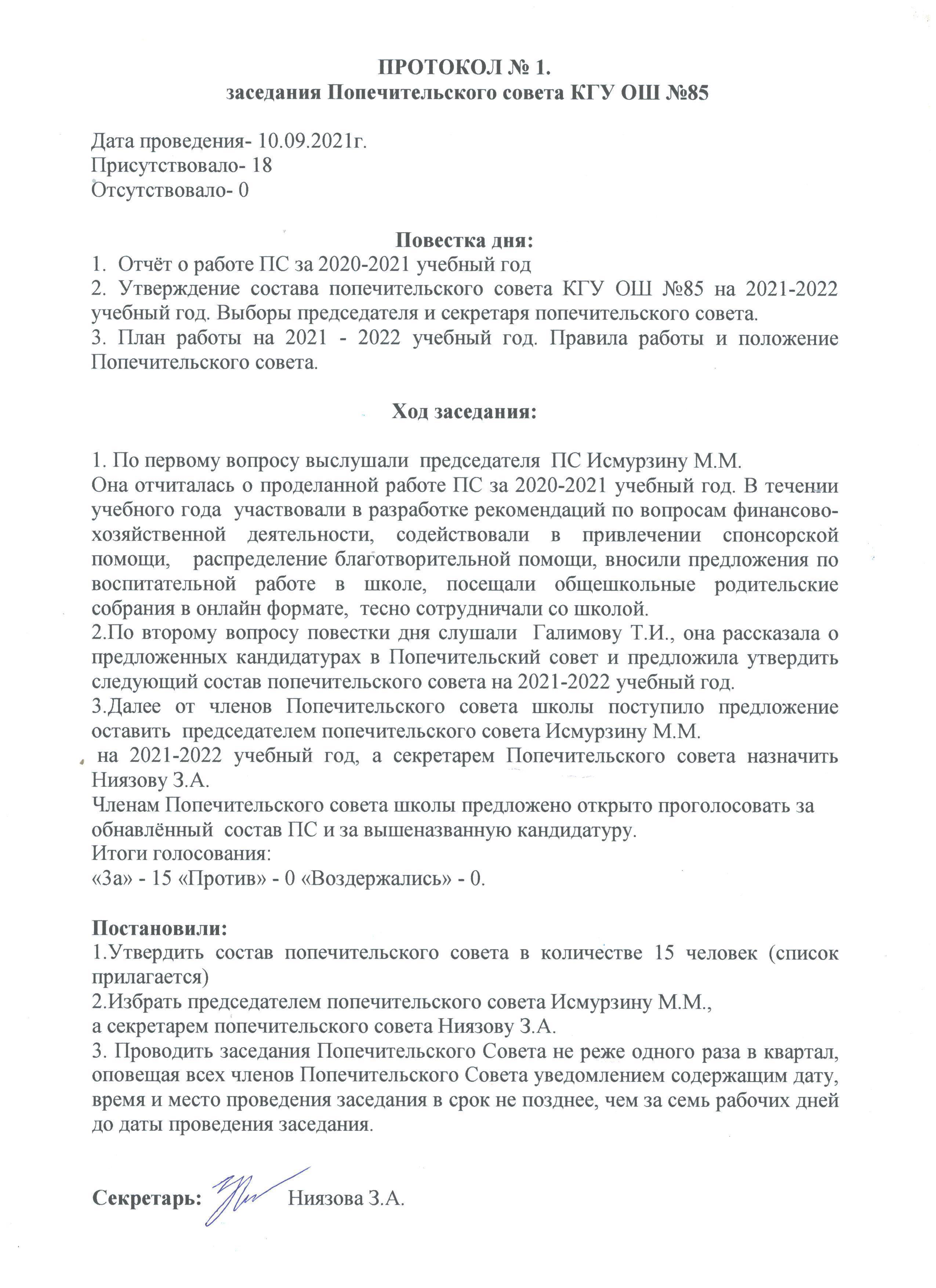 Протокол заседания Попечительского совета от 10.09.2021 г. » №85 Орта мектеп