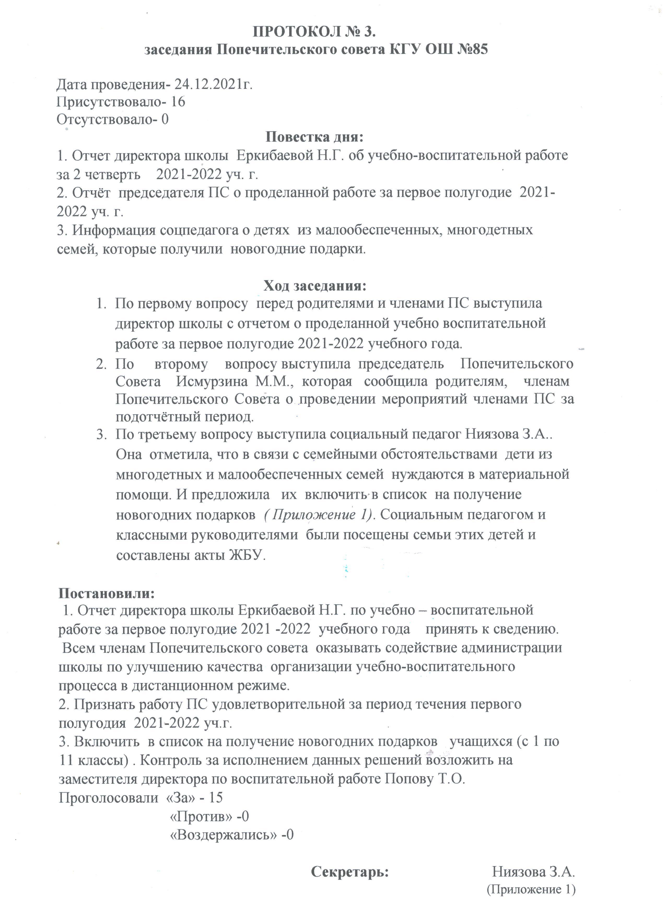 Протокол №3 заседания Попечительского совета от 24.12.2021 г. » №85 Орта мектеп