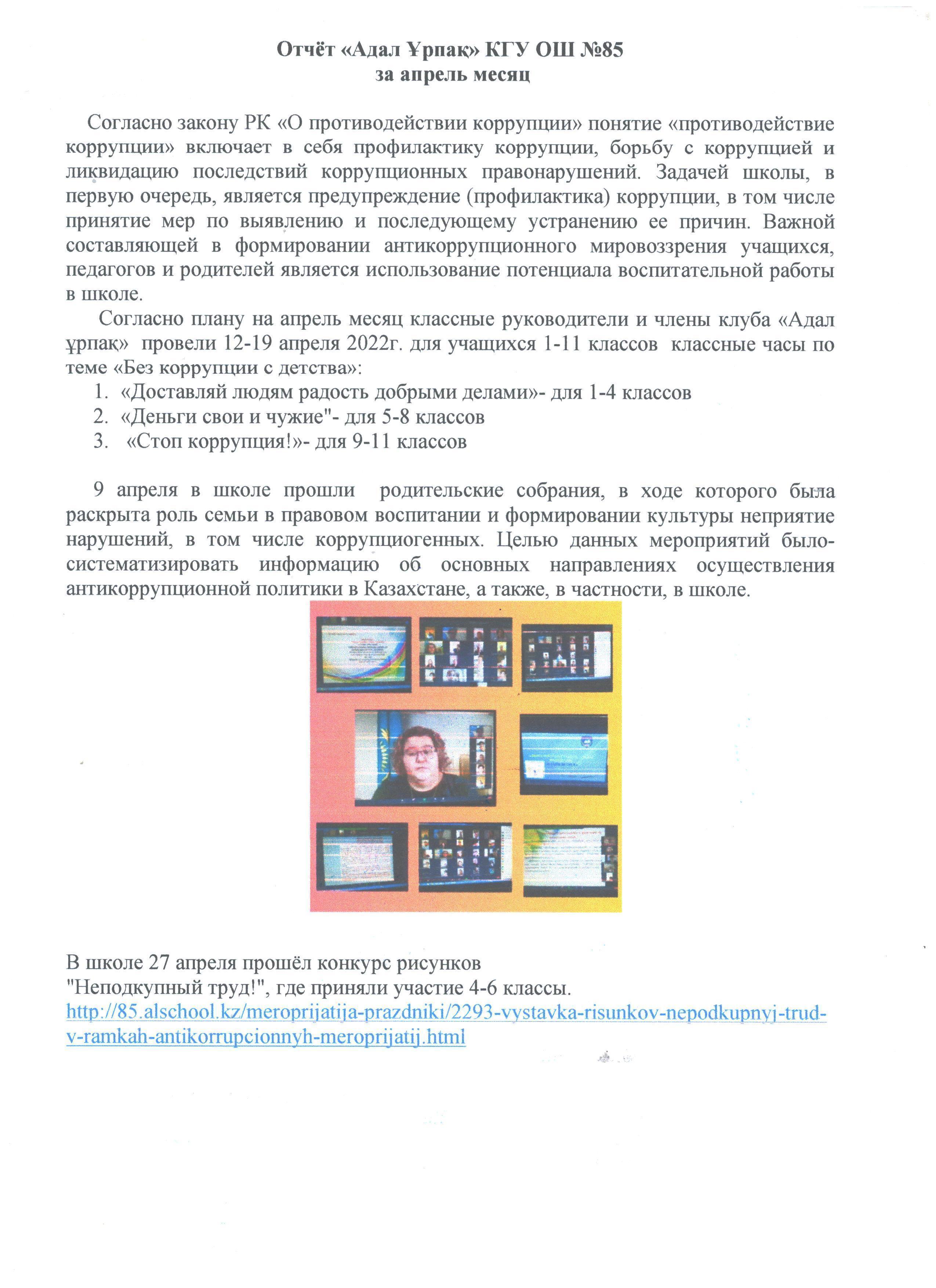 "Адал ұрпақ" мектеп клубының 2022 жылғы сәуірдегі жұмысы туралы есеп » №85 Орта мектеп
