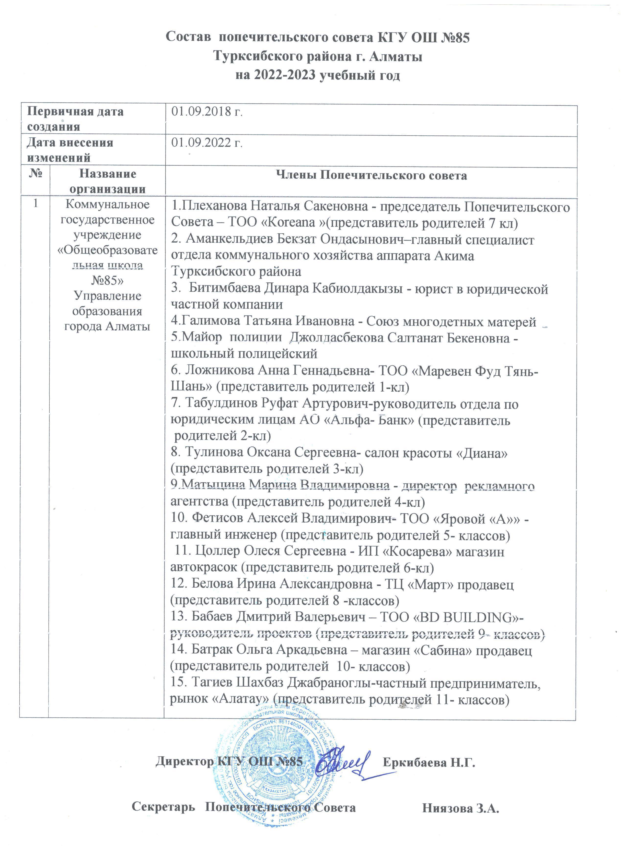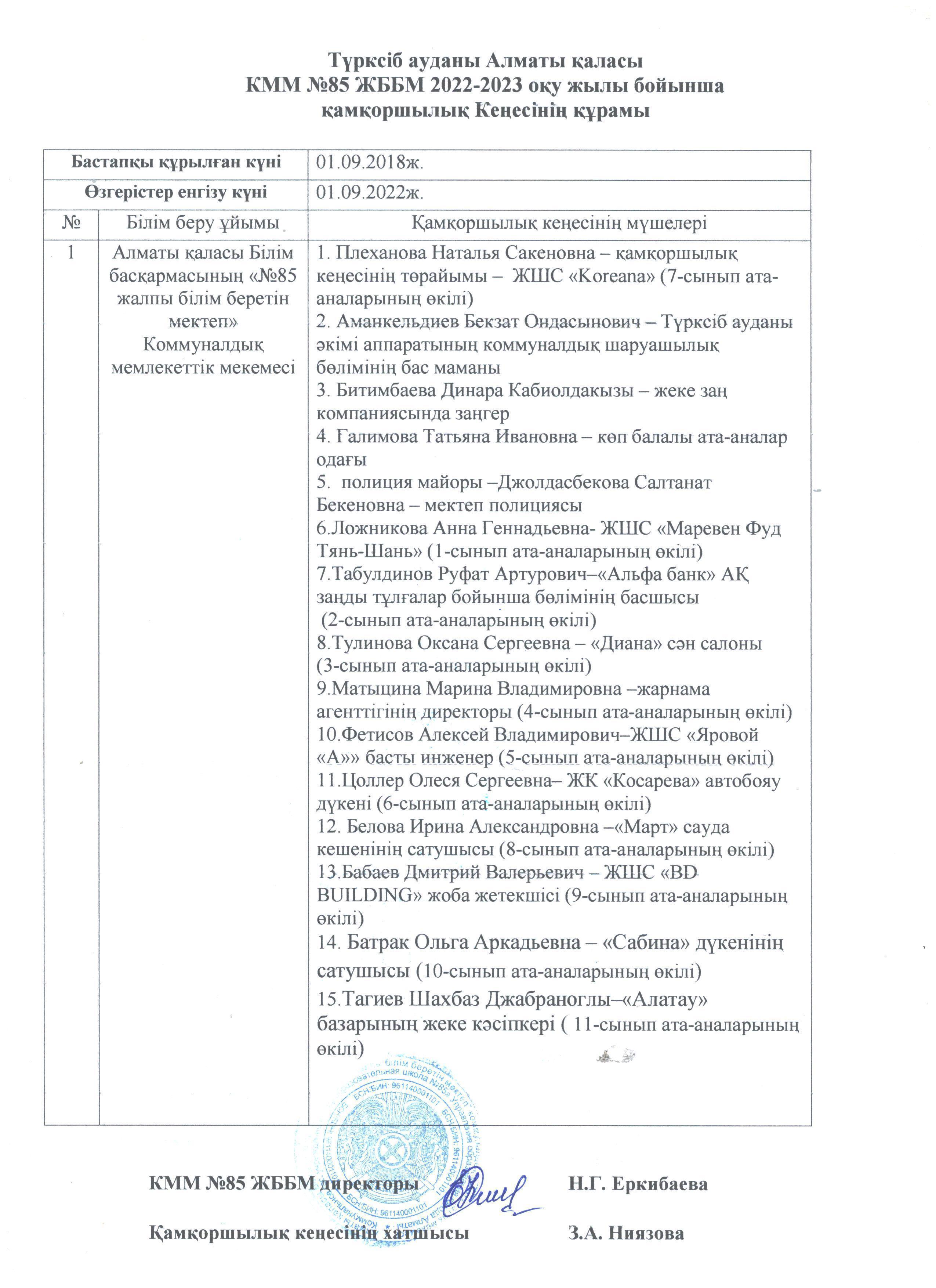 2022-2023 оқу жылы бойынша Қамқоршылық кеңесінің құрамы » №85 Орта мектеп