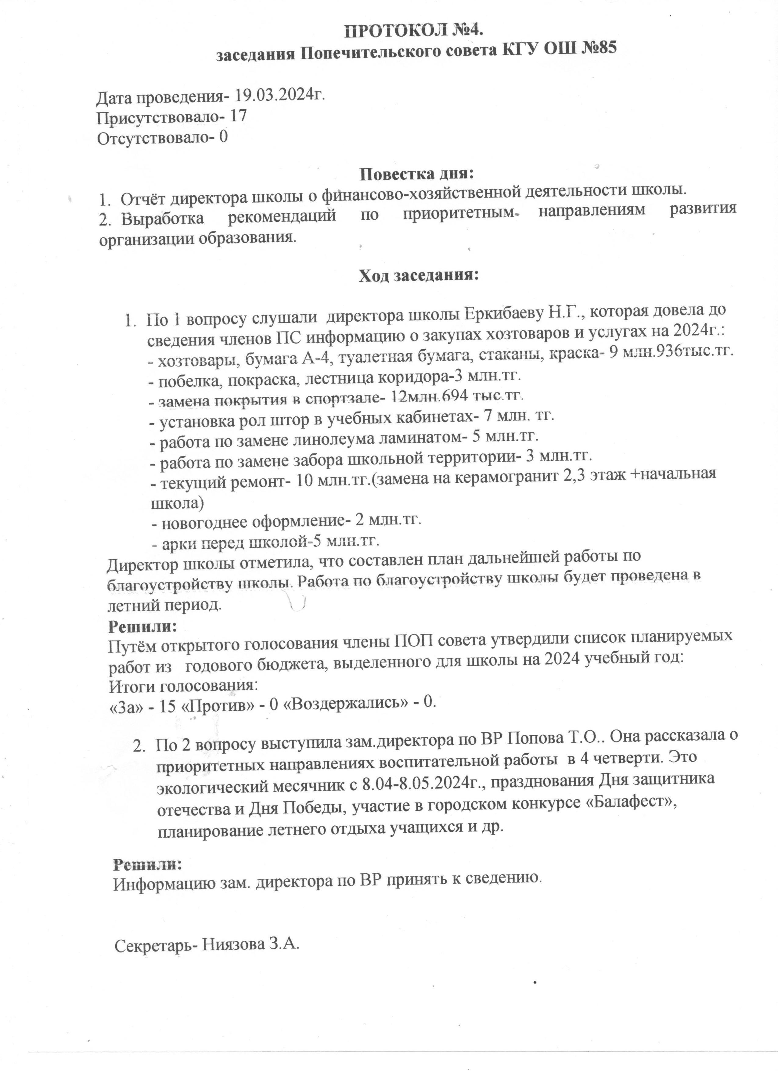 19.03.2024 ж. Қамқоршылық кеңес отырысының хаттамасы » №85 Орта мектеп