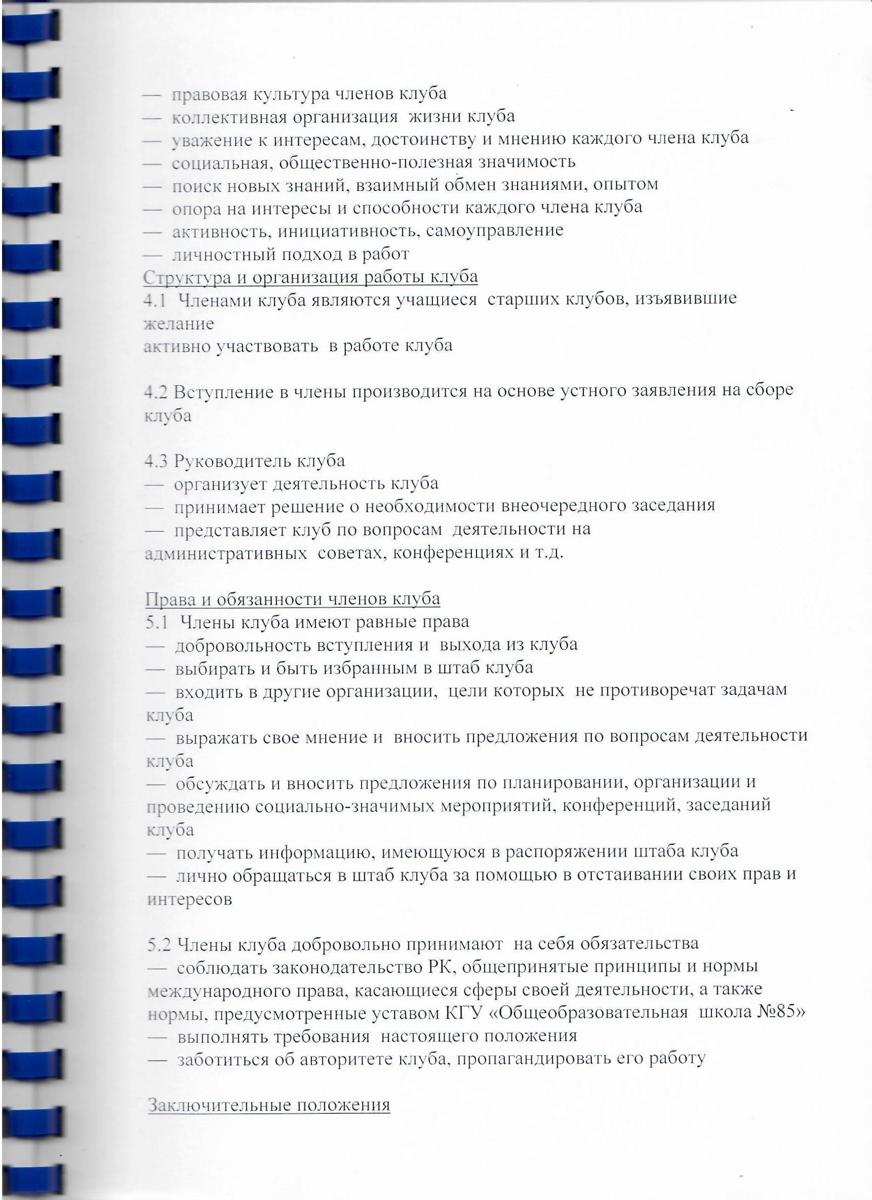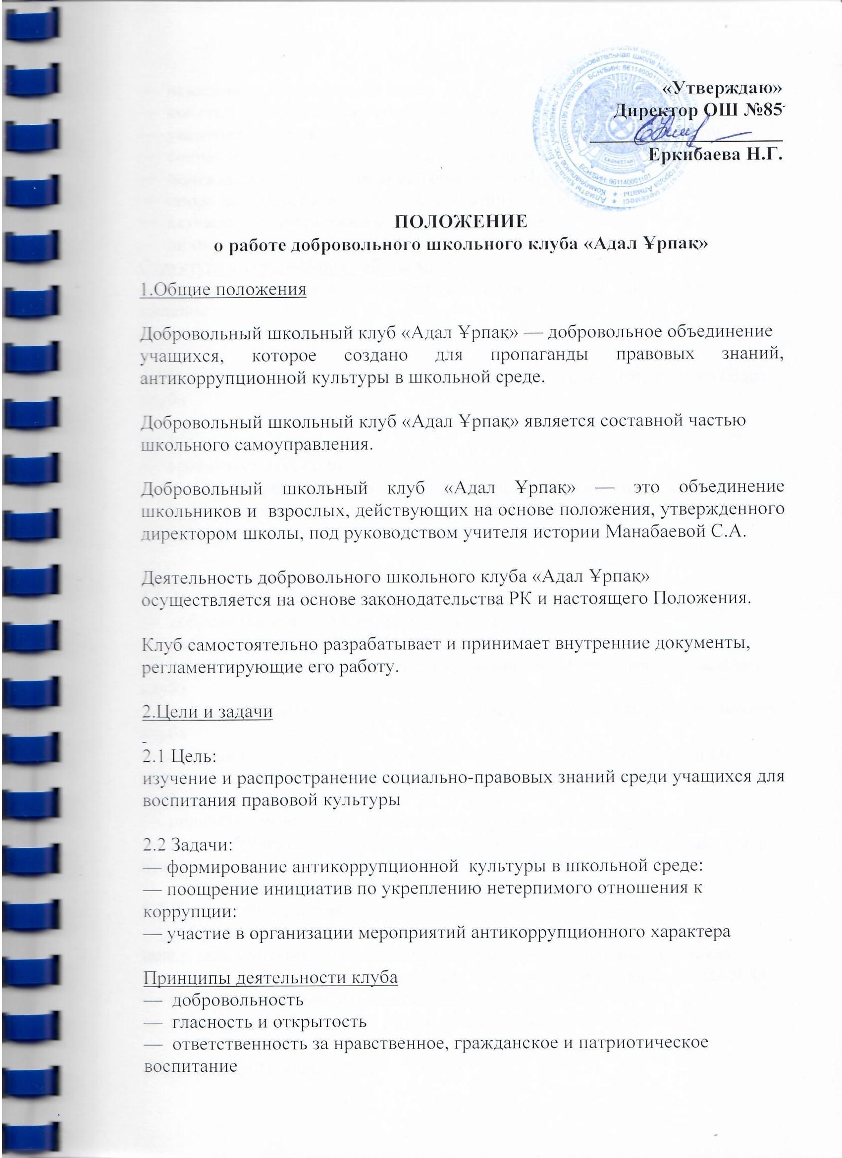 Положение о работе клуба "Адал ұрпақ" на 2019-2020 учебный год » №85 Орта мектеп