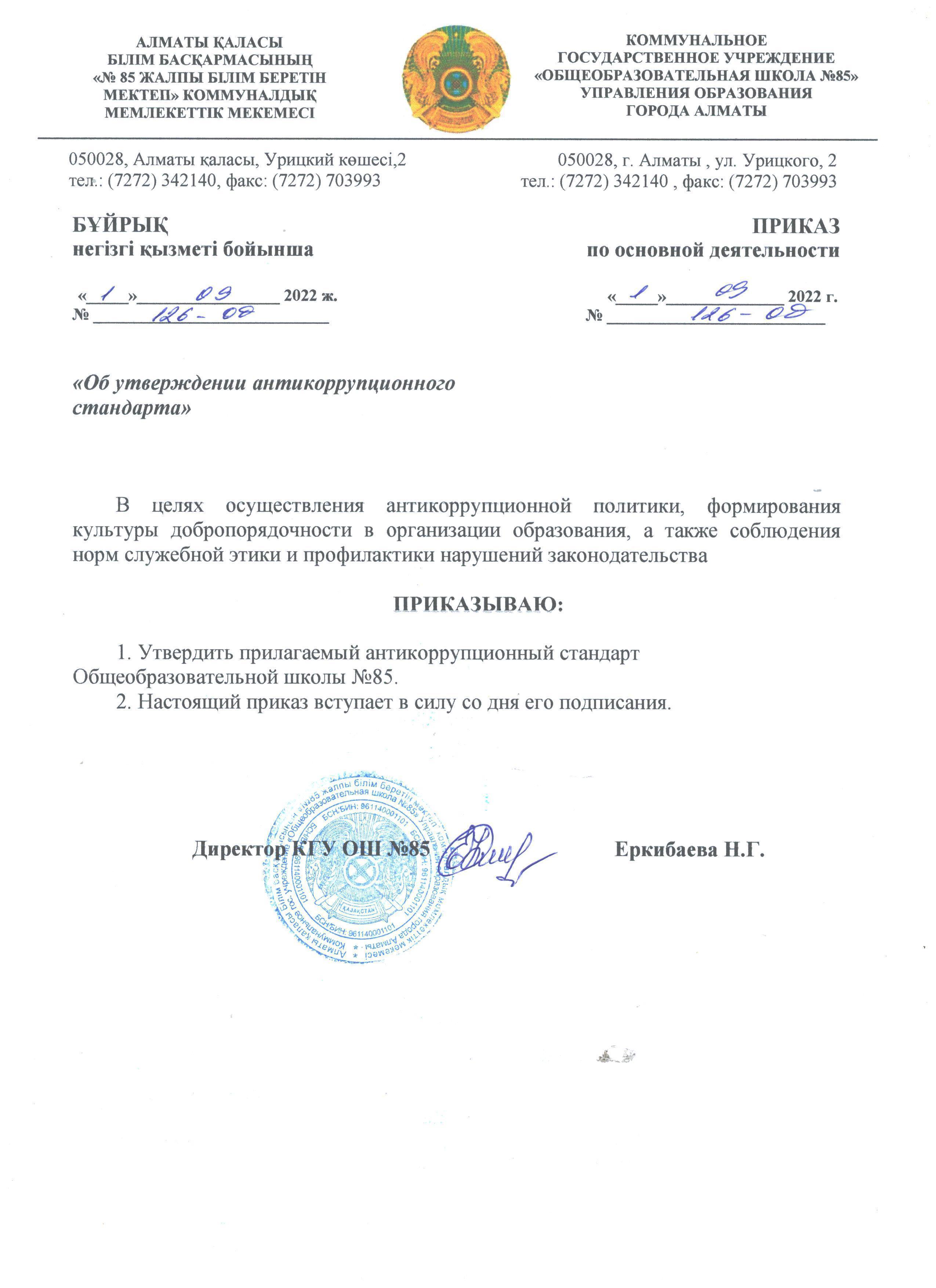 Сыбайлас жемқорлыққа қарсы стандартты бекіту туралы бұйрық » №85 Орта мектеп