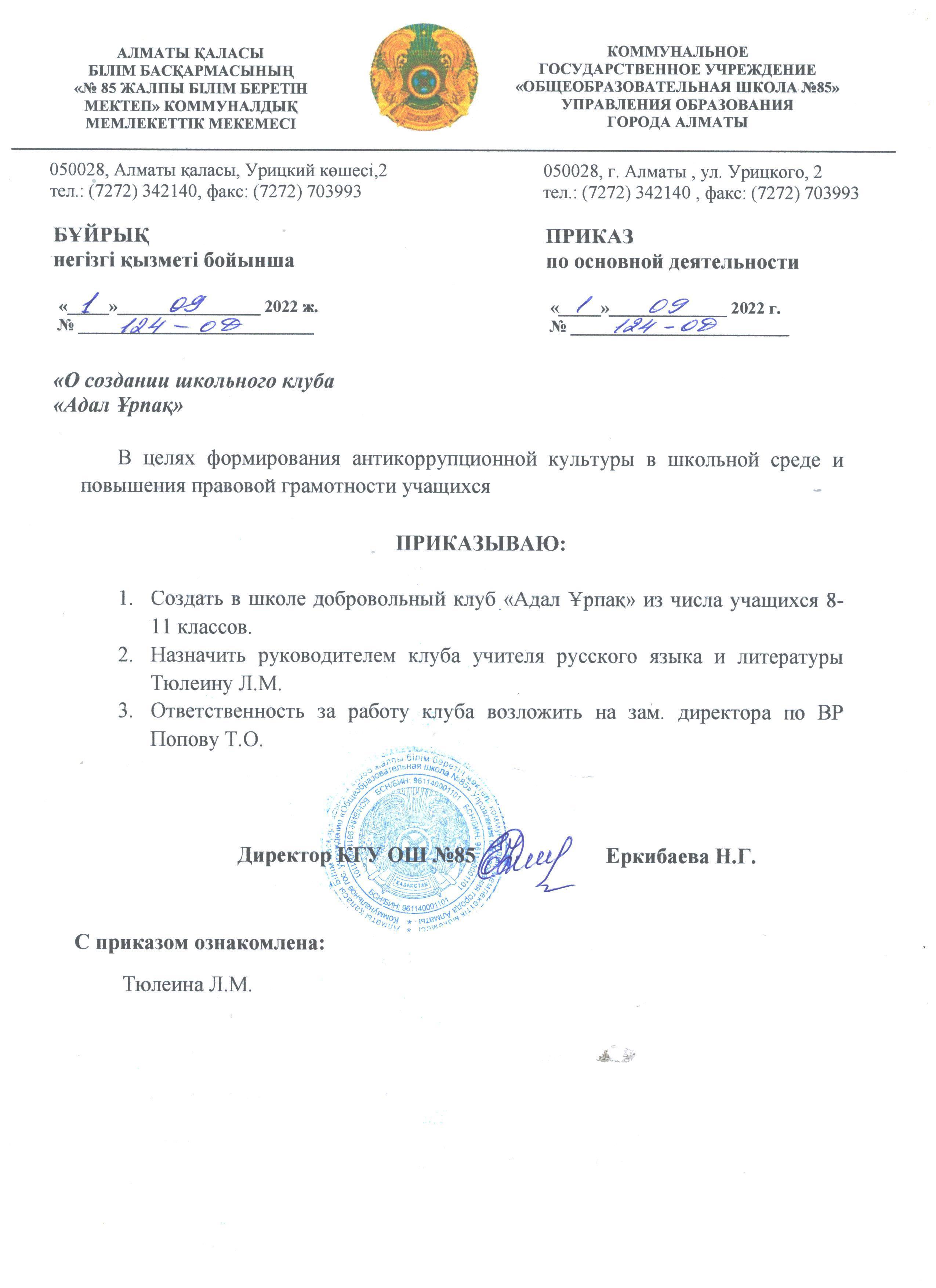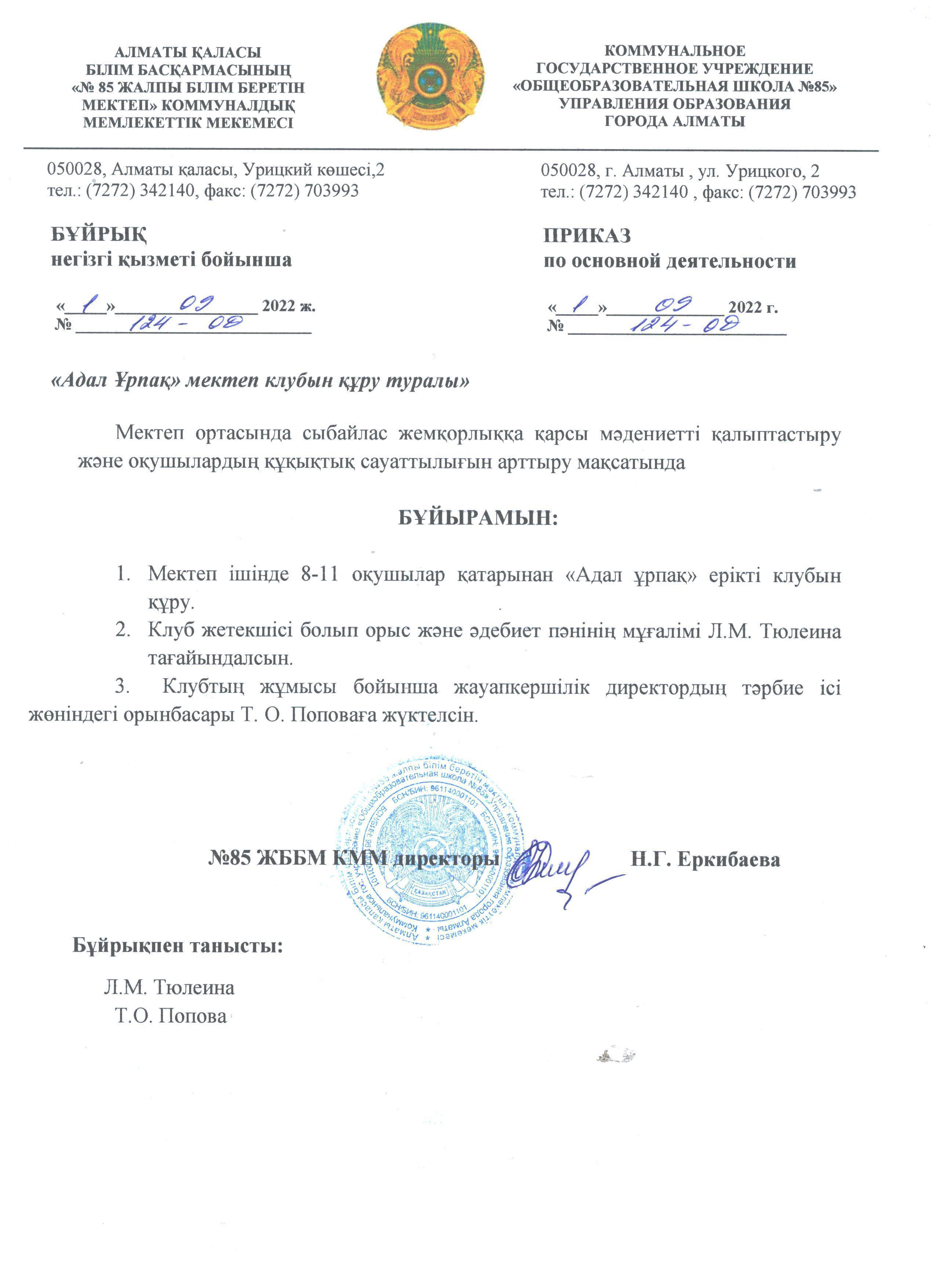"Адал Ұрпақ" мектеп клубын құру туралы бұйрық » №85 Орта мектеп