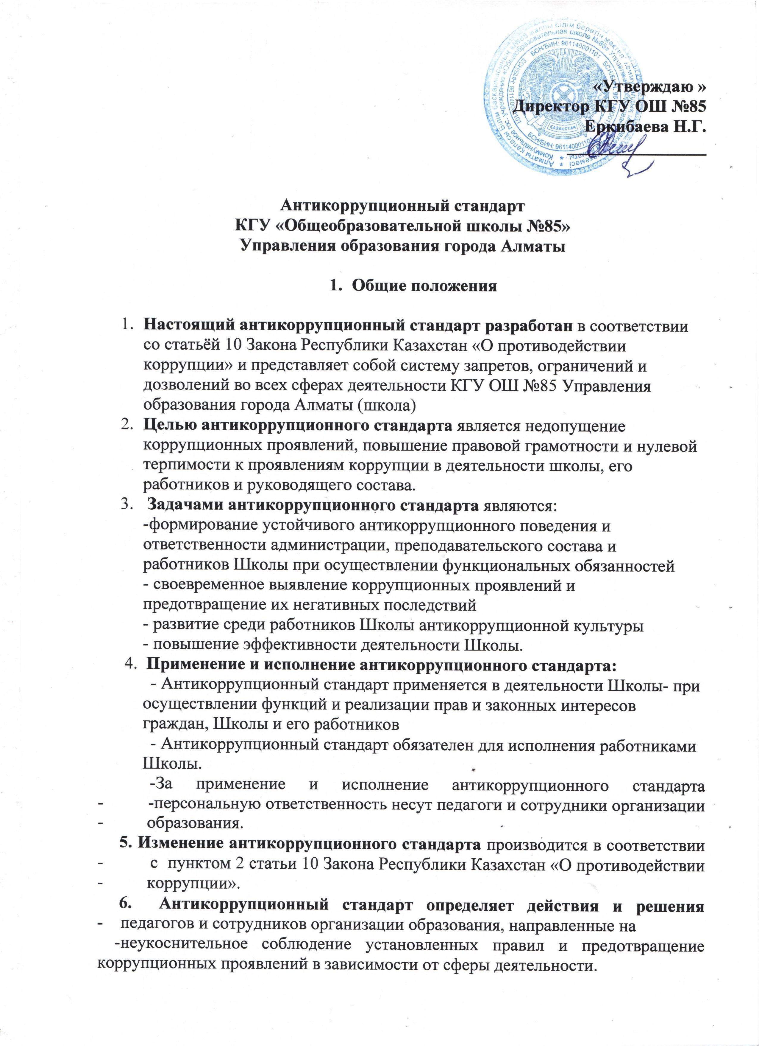 Сыбайлас жемқорлыққа қарсы стандарты » №85 Орта мектеп