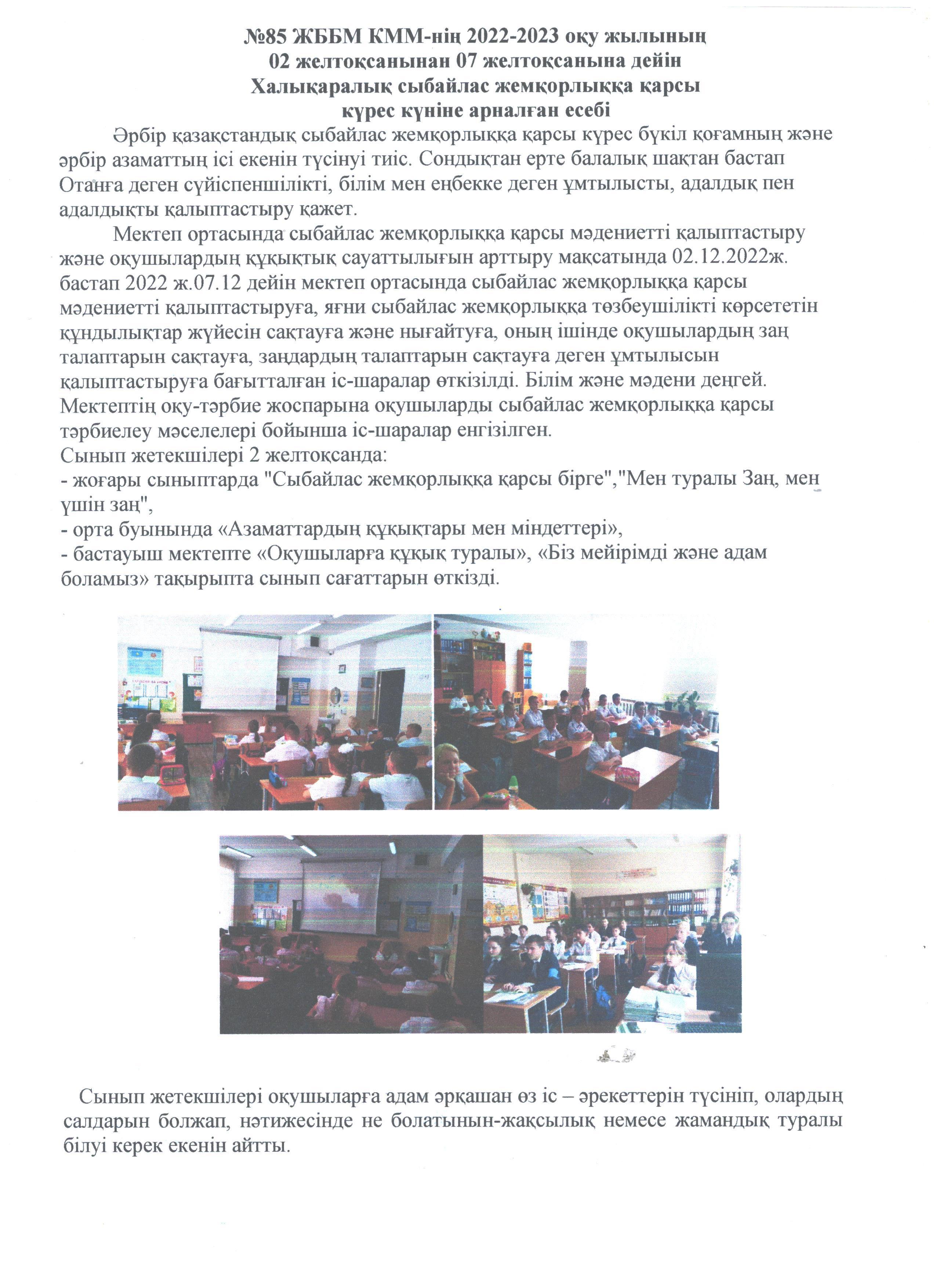 Халықаралық сыбайлас жемқорлыққа қарсы күрес күніне арналған есебі » №85 Орта мектеп