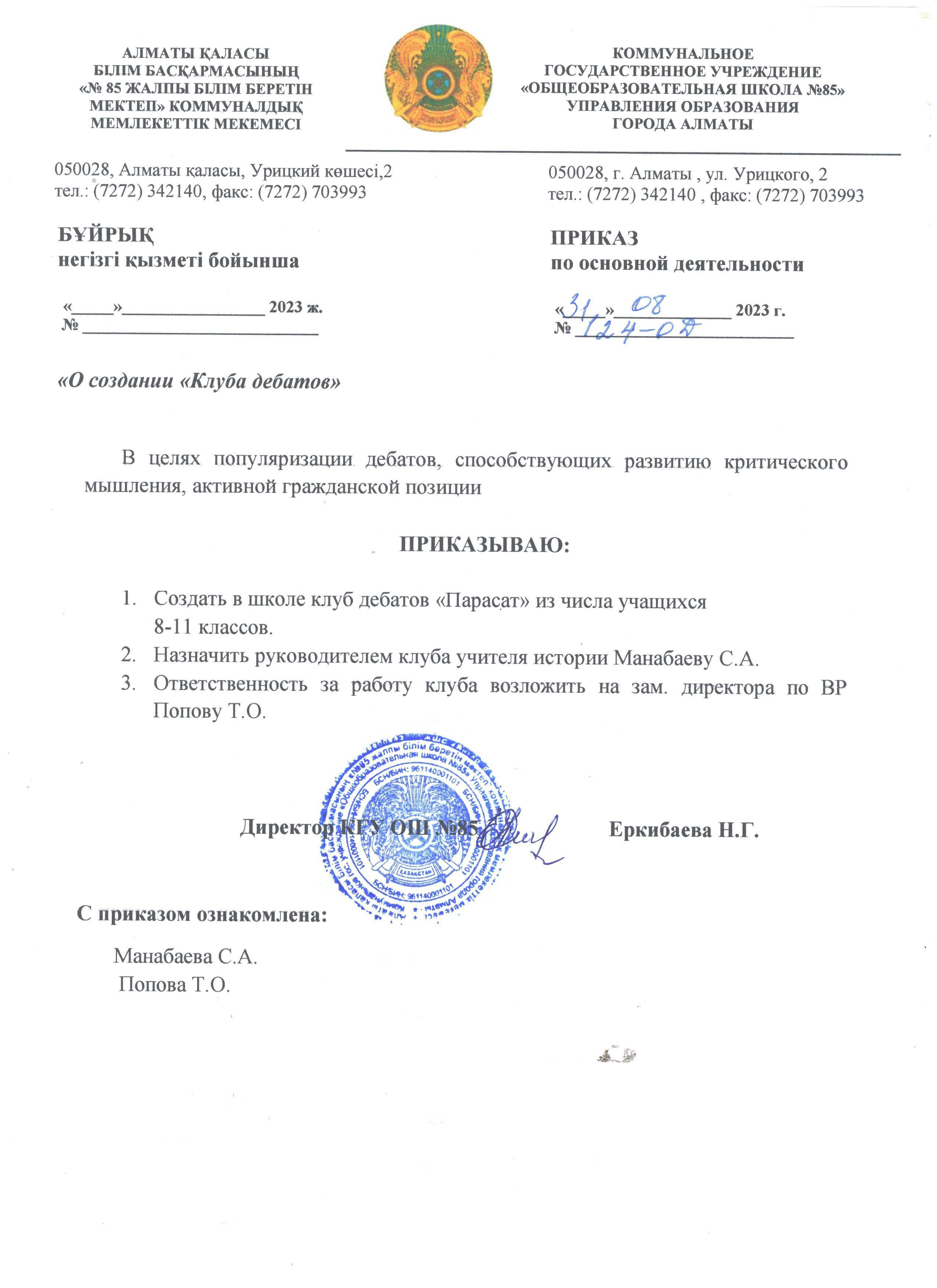 Пікірсайыс клубын құру туралы » №85 Орта мектеп
