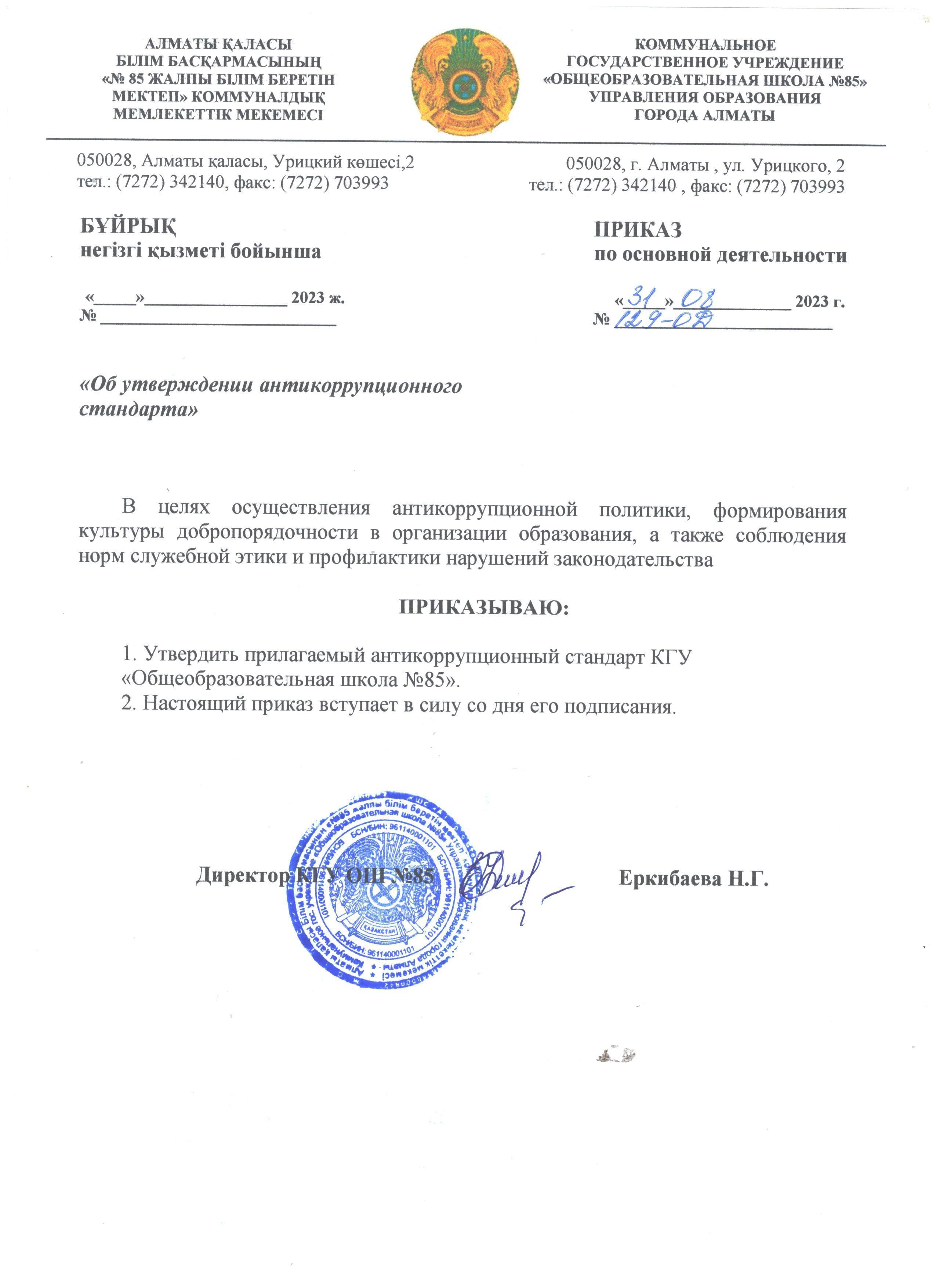 Сыбайлас жемқорлыққа қарсы стандартты бекіту туралы бұйрық » №85 Орта мектеп