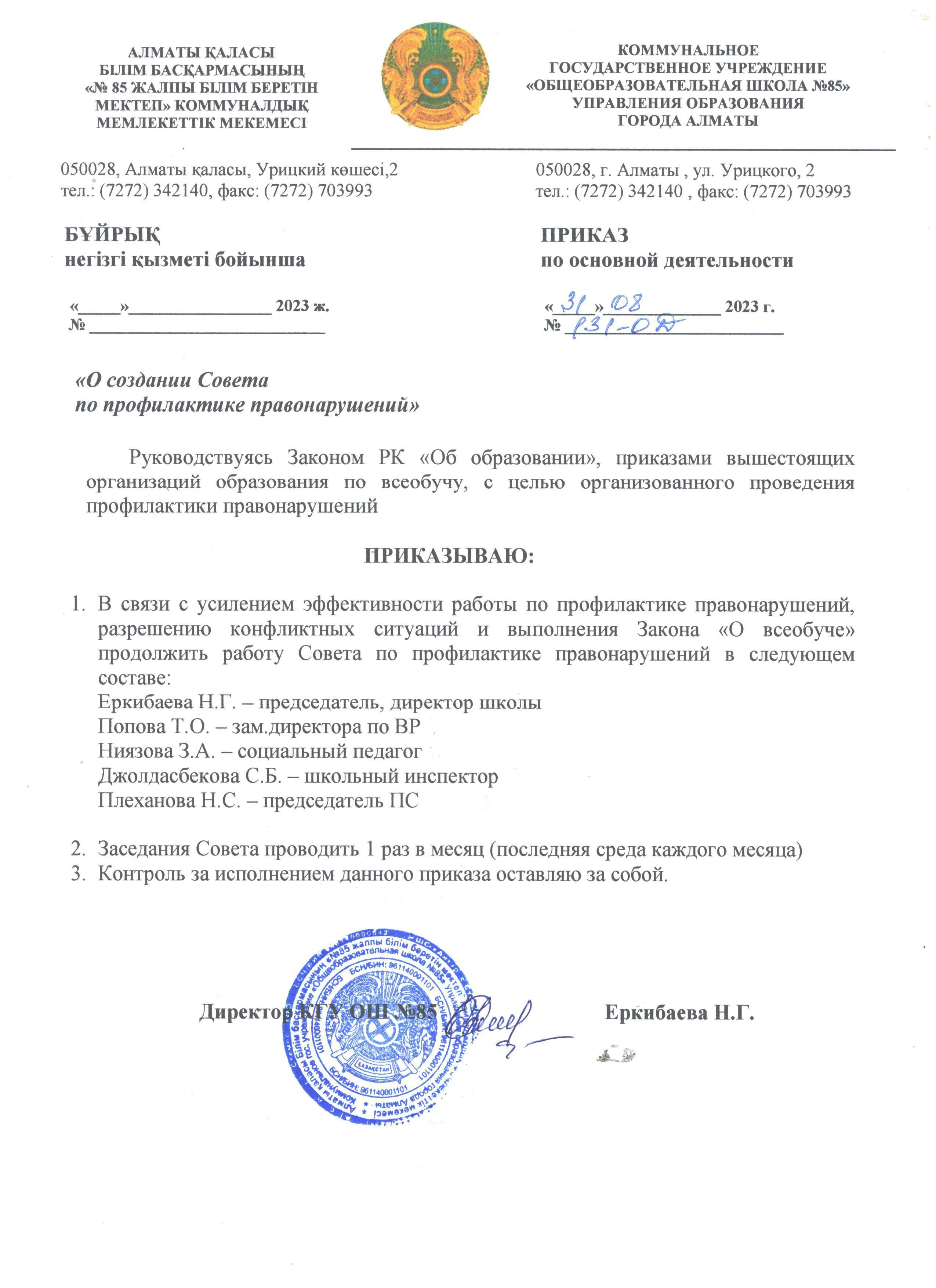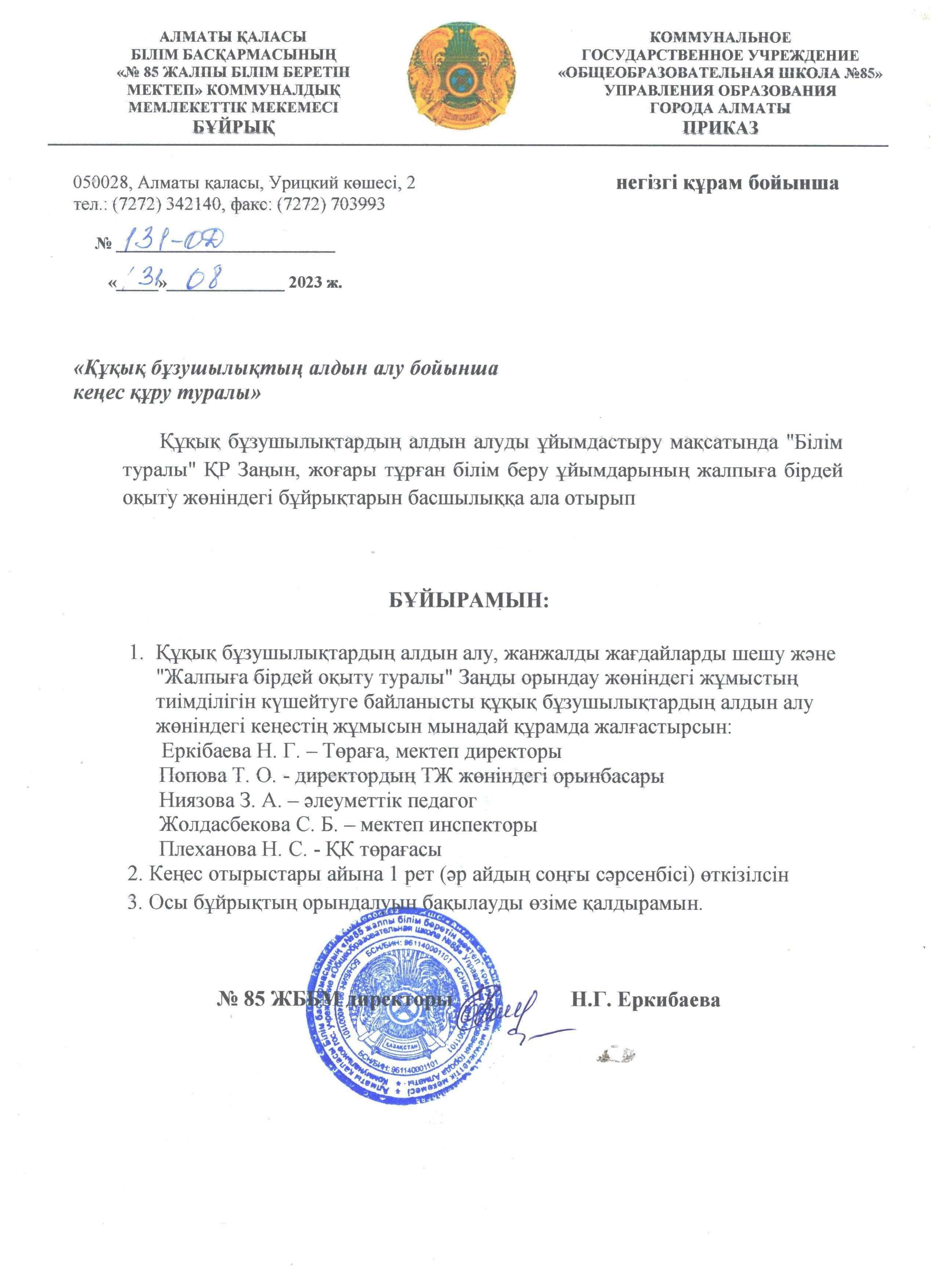 Құқық бұзушылықтың алдын алу бойынша кеңес құру туралы бұйрық » №85 Орта мектеп