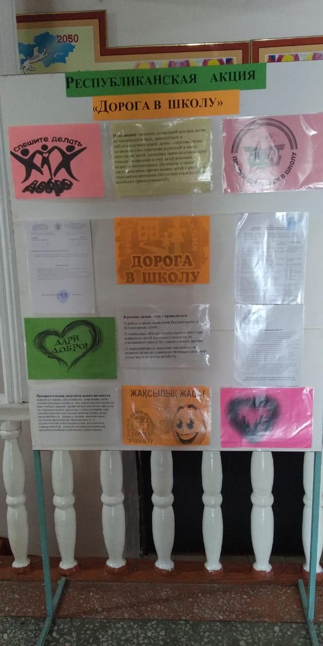С 1 июля 2019 г. началась республиканская акция "Дорога в школу". Цель акции: оказание материальной и финансовой помощи детям из малообеспеченных, многодетных семей, детям-сиротам и детям, оставшихся без попечения родителей и профилактика непосещаемости школы по социальным причинам.