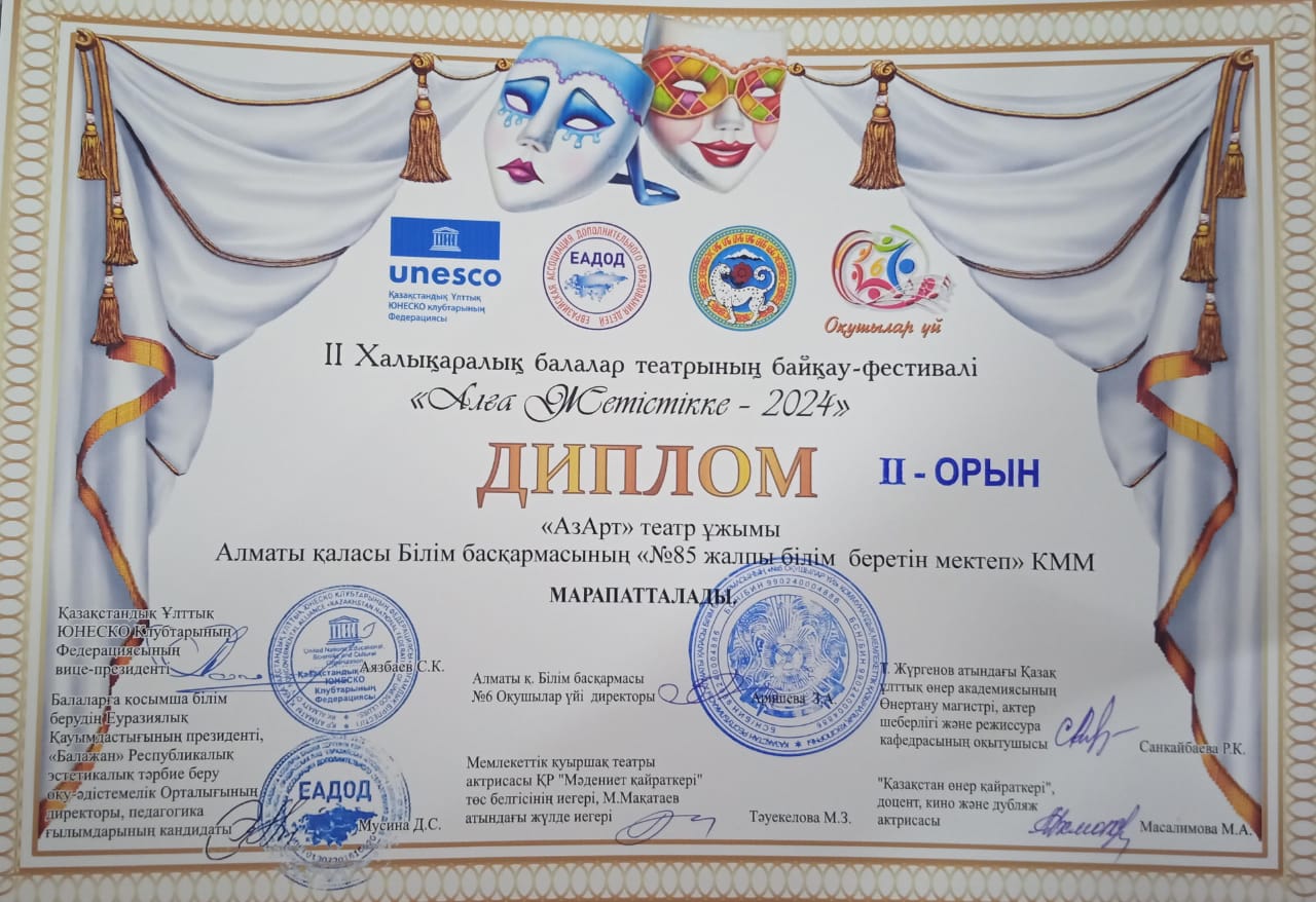 № 85 ЖББМ КММ "АзАрт" театр үйірмесі театр өнерінің II Халықаралық балалар фестивалі-конкурсында 2 орын алды. Басшылар - Руденко Г.П. және Бочкарев А.В. Құттықтаймыз!