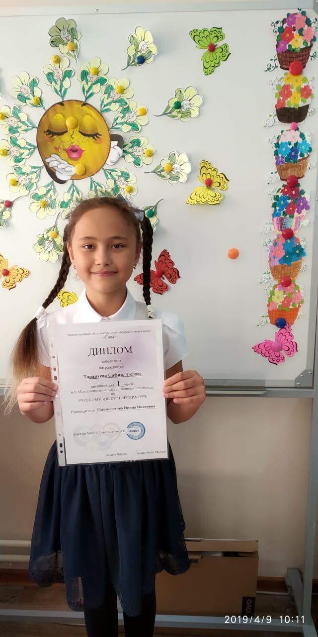 Ученица 4 "А" класса Тараруева Сафия заняла 1 место в ІІ Международной дистанционной олимпиаде по русскому языку и литературе