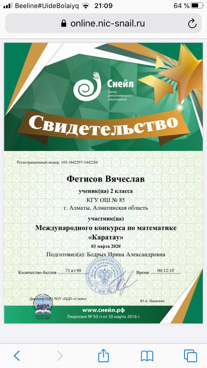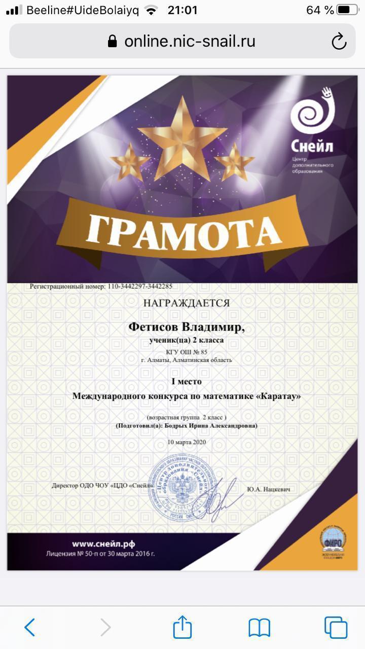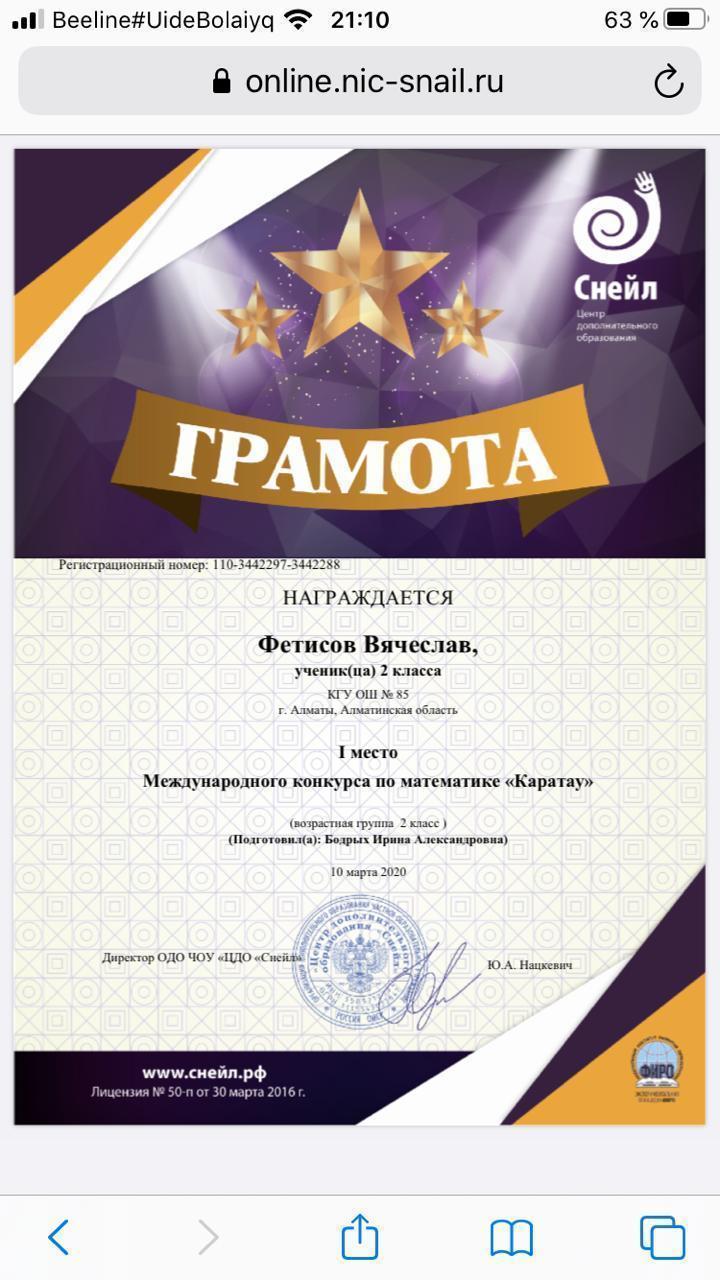 03 апрель 2020 0 1 2 3 4 5 Наши призеры Грамотами за участие в международном конкурсе по математике "Каратау" награждаются ученики 2 класса ОШ №85 Фетисов Владимир и Фетисов Вячеслав