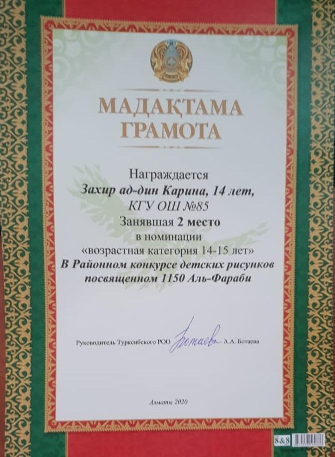 27 август 2020 0 1 2 3 4 5 Наши призеры Ученица КГУ ОШ №85 Захир ад-дин Карина заняла 2 место в районном конкурсе рисунков, посвященном 1150-летию Аль-Фараби.