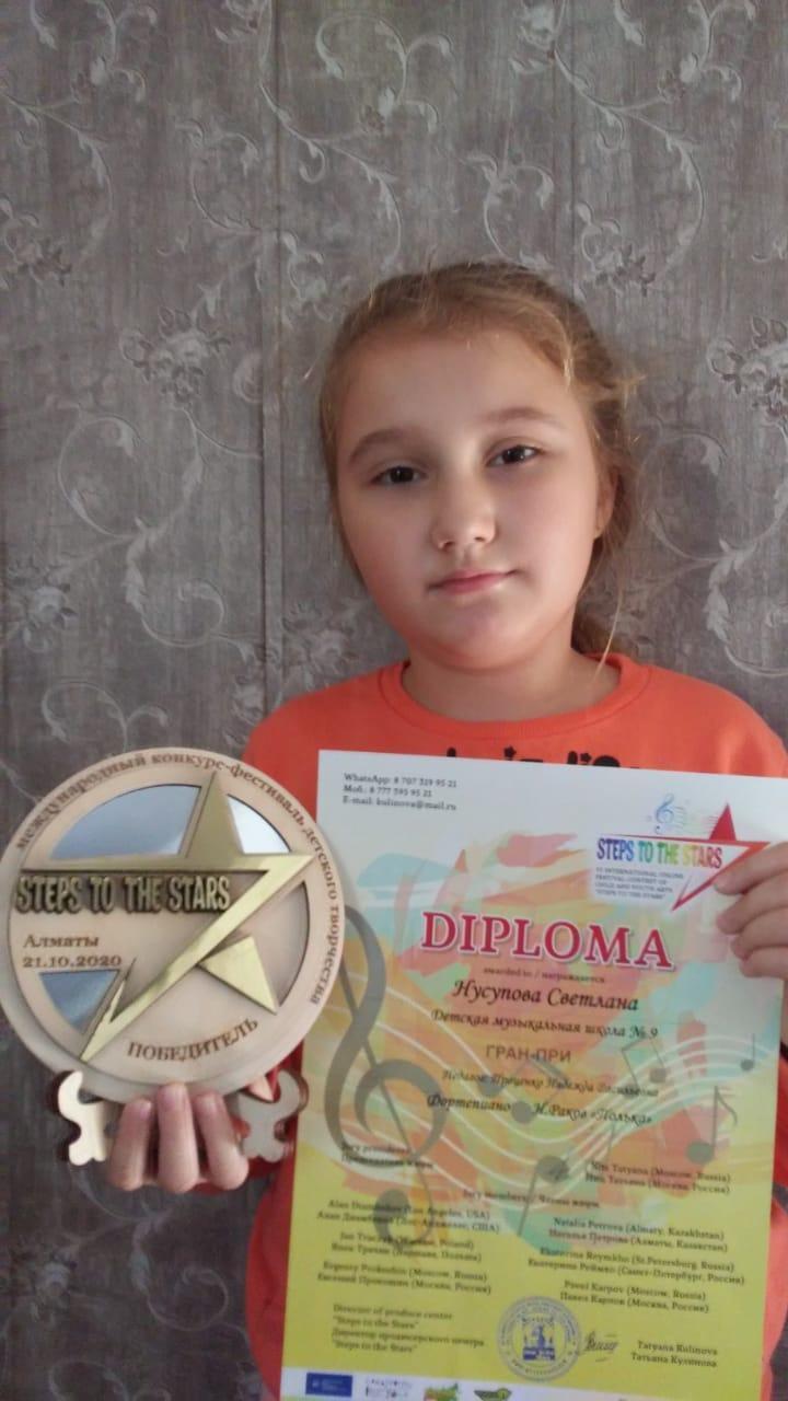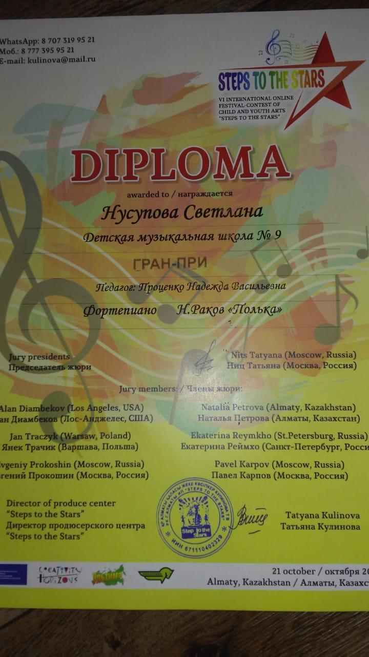 29 октябрь 2020 0 1 2 3 4 5 Наши призеры Ученица 3 "Б" класса КГУ ОШ №85 Нусупова Светлана заняла Гран-При в международном конкурсе по игре на фортепиано.