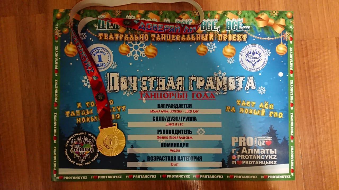 08 декабрь 2020 100 1 2 3 4 5 Наши призеры Ученица 5 "А" класса КГУ ОШ №85 Молнар Алина заняла 1 место на чемпионате ProТанцыKZ в номинации "модерн хореография".