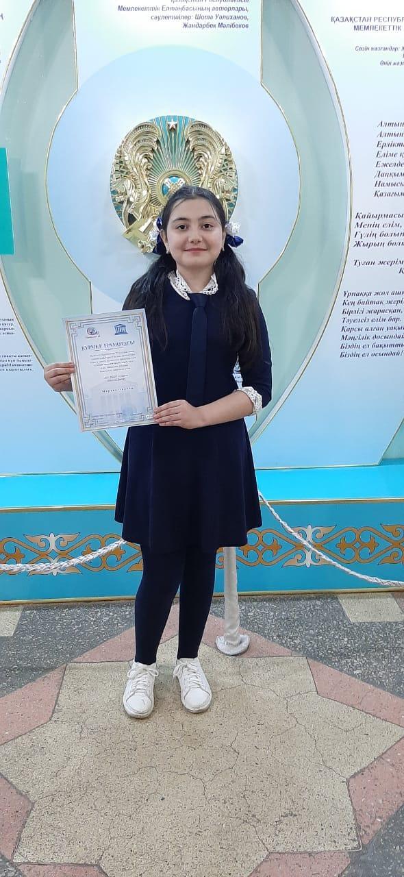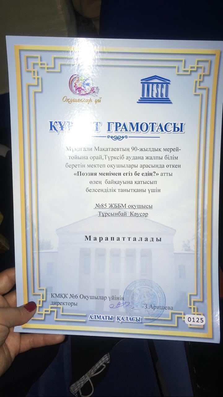03 март 2021 0 1 2 3 4 5 Наши призеры Ученицы КГУ ОШ №85 Аббасова Зарифа и Тұрсынбай Кәусар награждены грамотой за активное участие в конкурсе чтецов в честь 90-летнего юбилея М.Макатаева, среди учащихся общеобразовательных школ Турксибского района.
