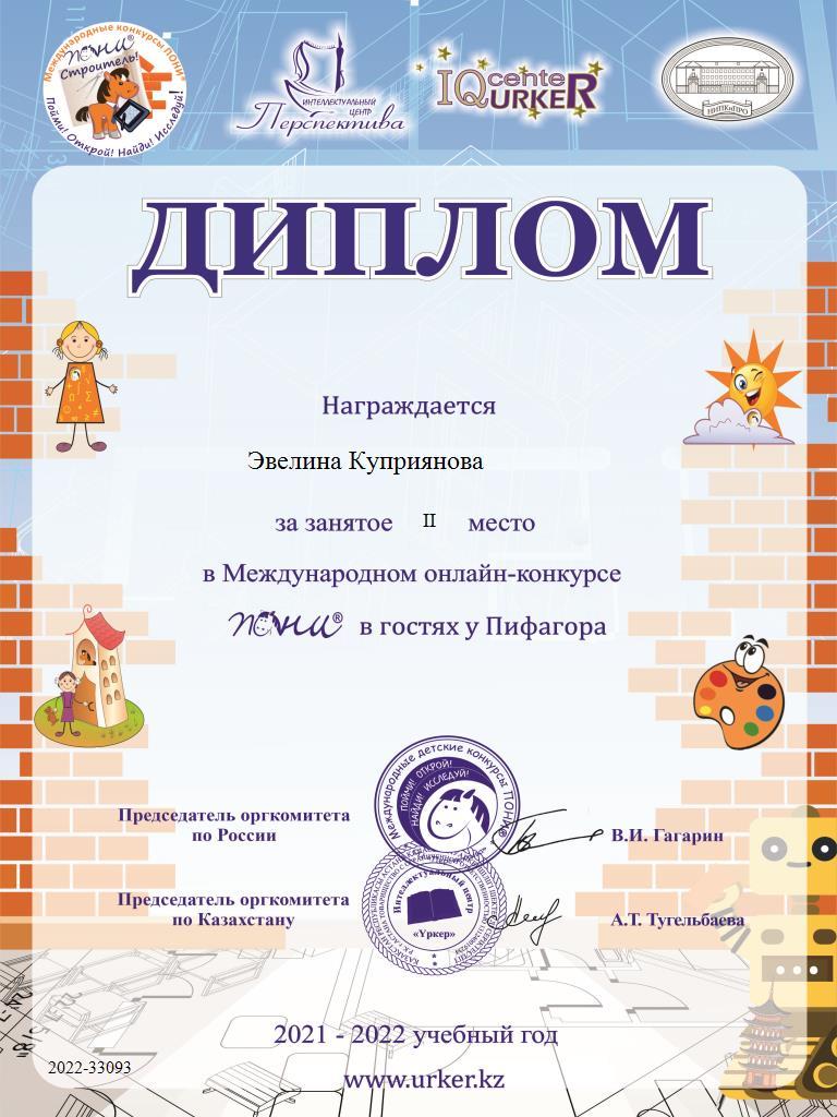 27 январь 2022 0 1 2 3 4 5 Наши призеры Ученица 2 "В" класса Куприянова Эвелина заняла 2 место в международном конкурсе "Пони в гостях у Пифагора".